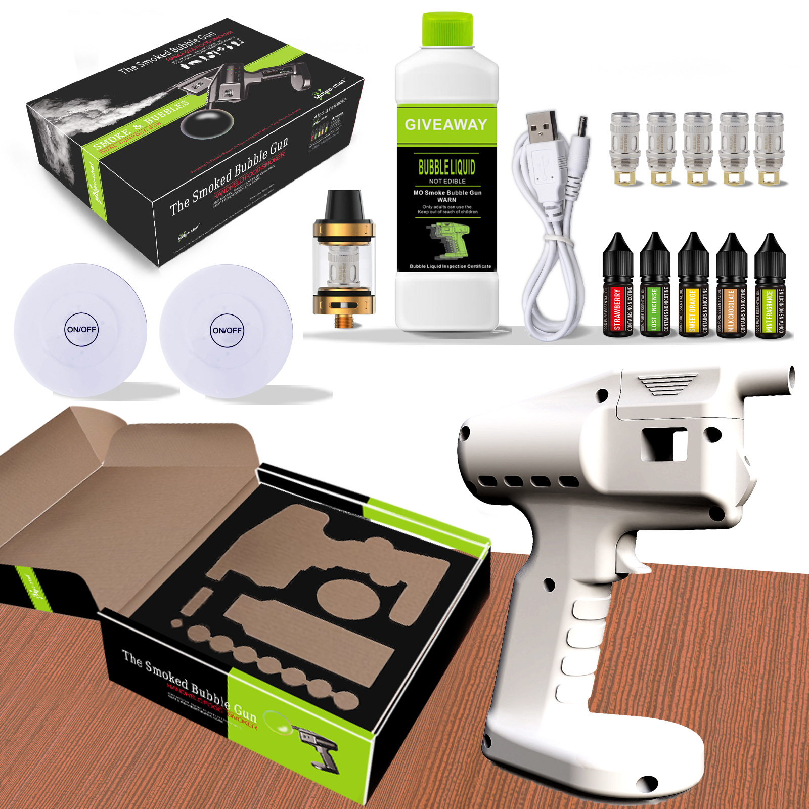 【包装清单】:气泡枪主机1 油箱1 海绵芯5 充电线1 气泡液1 精油5 防震包1 说明书1 彩色包装盒