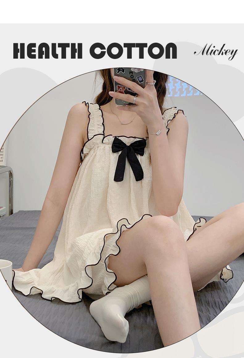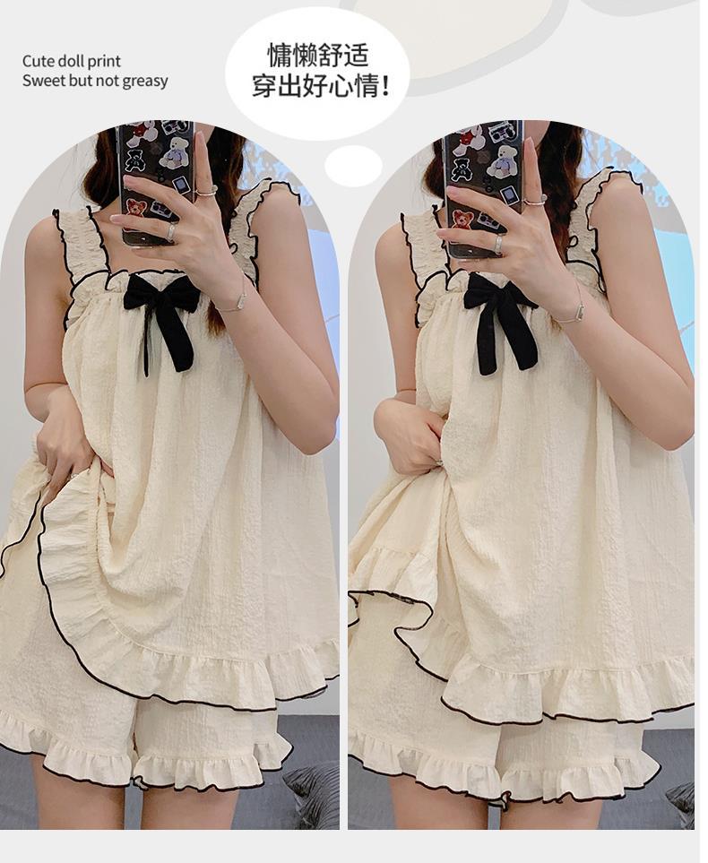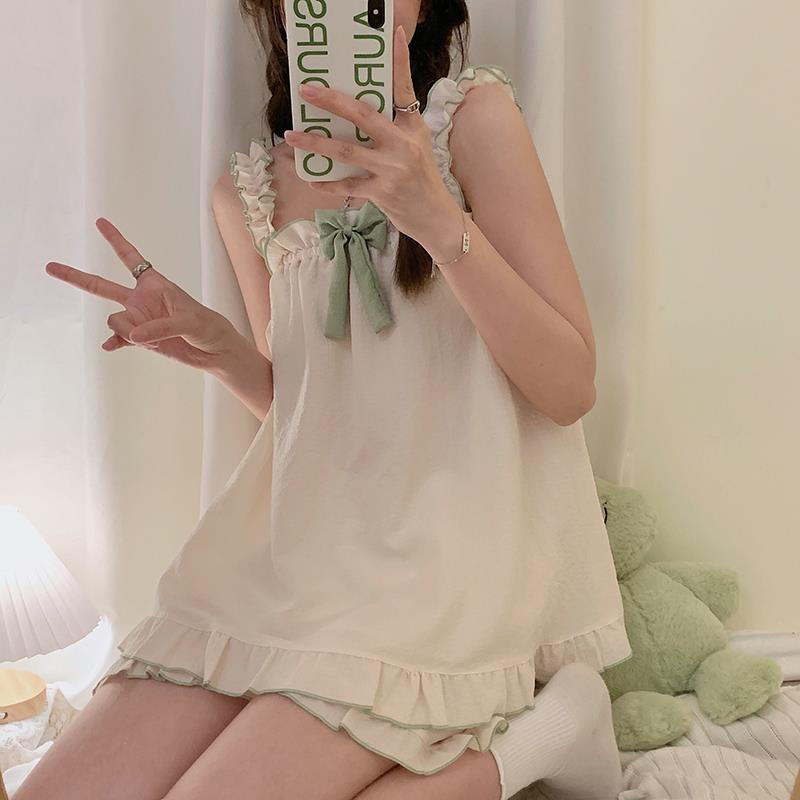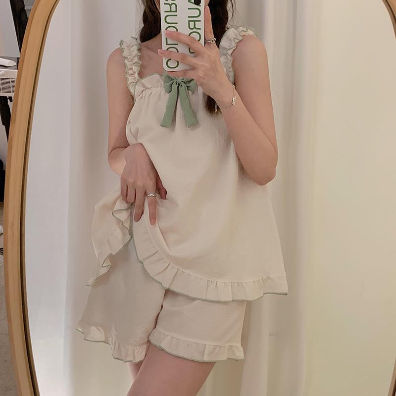 새로운 여름 잠옷 여자의 나비 거품 면 슬링 반바지 간단한 달콤한 가정 옷 세트 밖에서 입을 수 있습니다