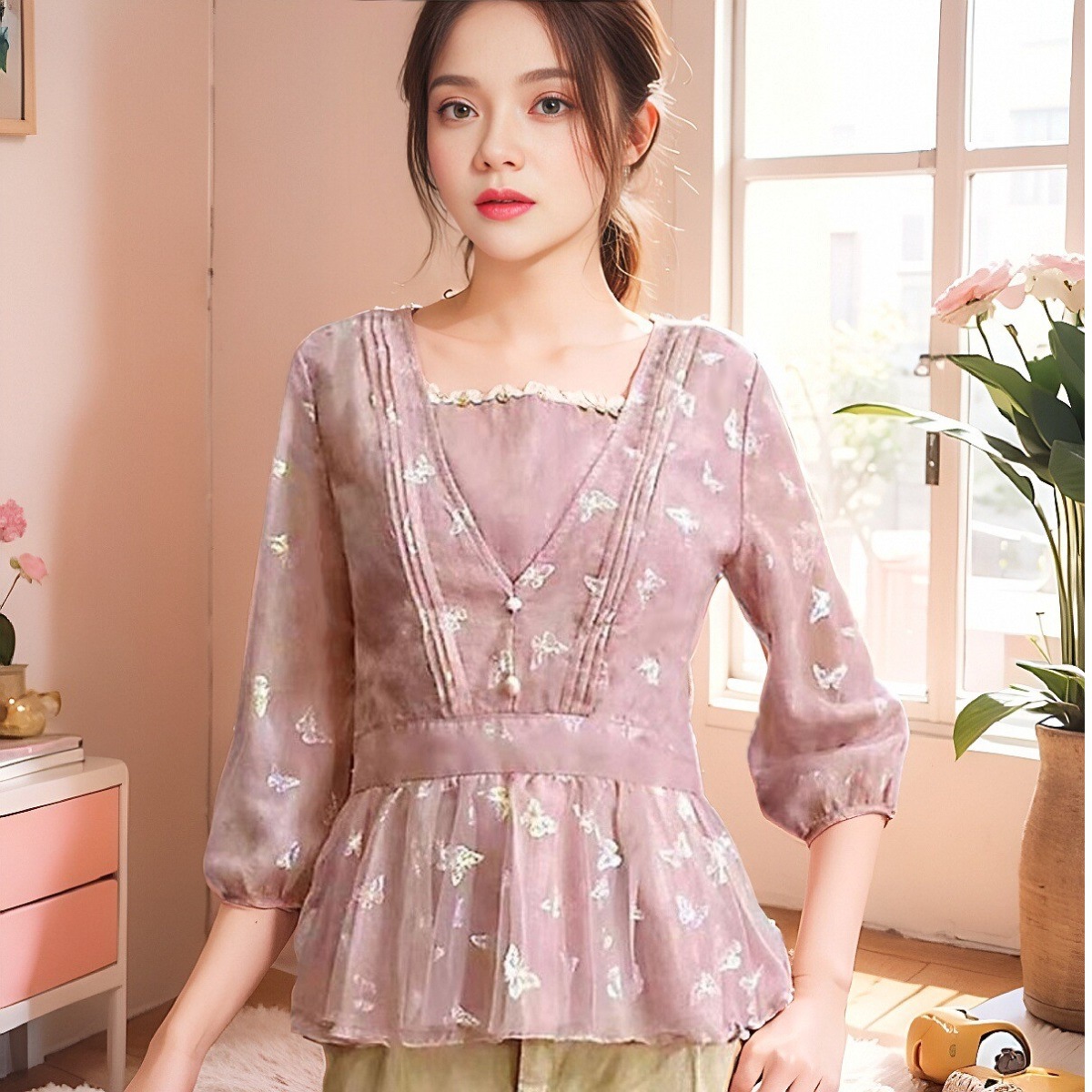 봄과 여름 허리 달콤한 쉬폰 셔츠 여성의 새로운 예술적 디자인 셔츠 Tung ice