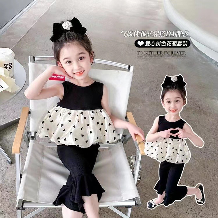 2023 여름 새로운 한국 스타일 여자 아이들의 유행 귀여운 캐주얼 느슨한 사랑 버블 원피스 세트 투피스 세트