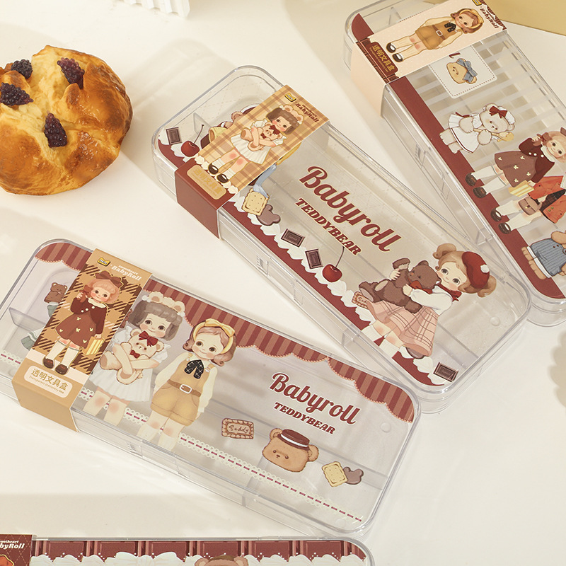 투명 문구 상자 계란 롤 자매 곰 파티 만화 아크릴 투명 연필 상자 간단한 일본 문구 상자