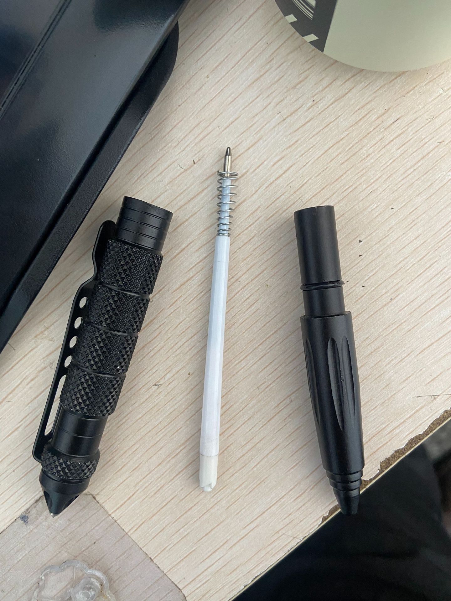 绝对推荐的一款随身笔,做工精美,航空铝材质轻易携带强度较好,笔身设计单而且牢固。表面氧化处理平常使用不易掉色,笔原配笔芯为中性笔芯。笔头部分镶嵌超硬度钨钢头(钨钢,俗称碳化钨属硬质合金制品,硬度高达14)。把握处采用菱形螺纹设计,增大摩擦力,把握更牢固,不易脱手,有效使出战术动作,提高安全系数。可旋转伸缩隐藏笔芯,操作简单方便实用。