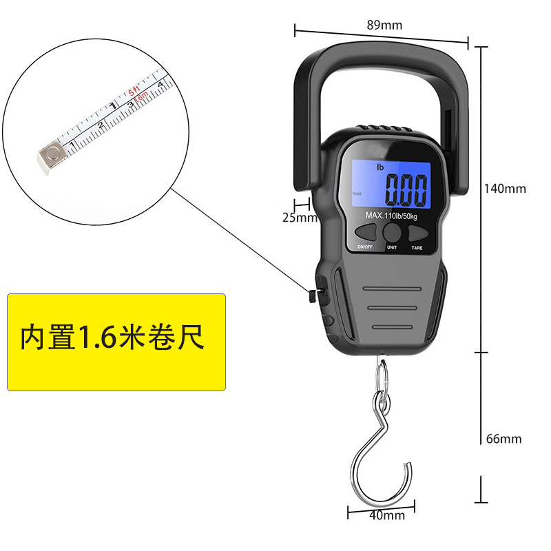 功能:称重,单位转换,自动归零,低电量显示,超重保护,自动关机, 内置1.6米卷尺