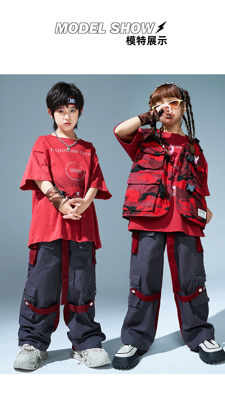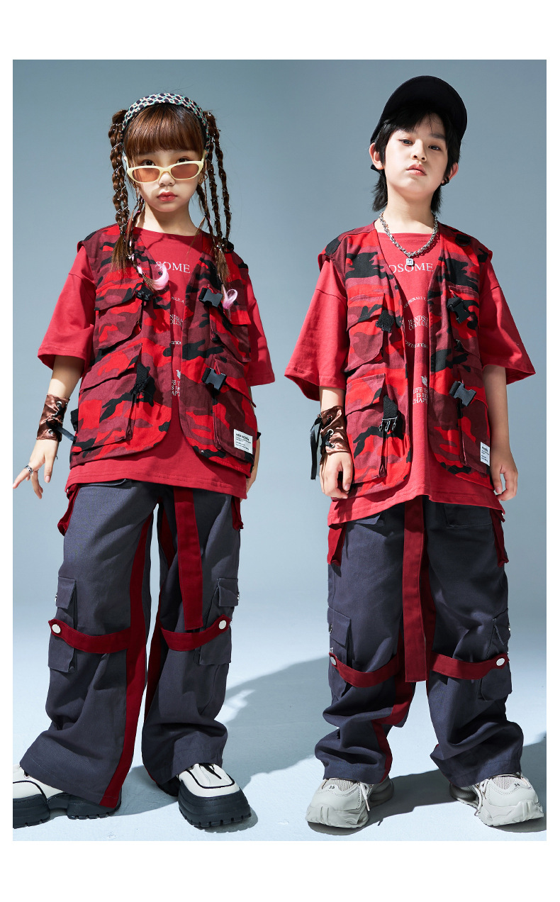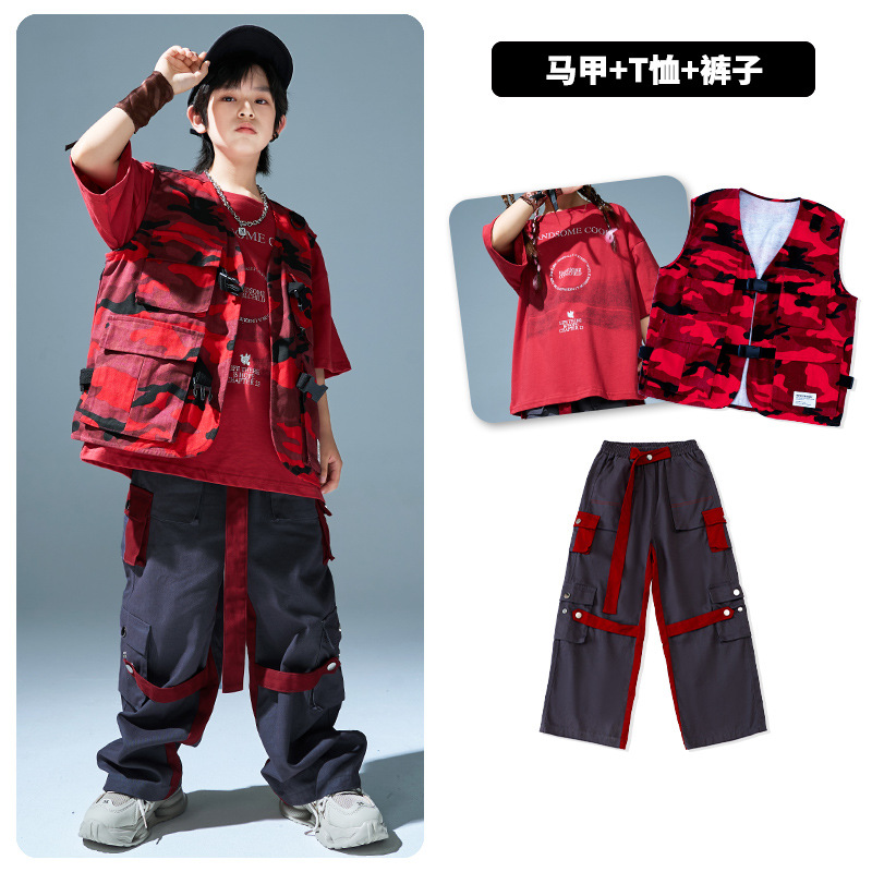 • 3 피스 세트 [빨간색 짧은 소매 + 회색 바지 + 빨간색 위장 조끼]]