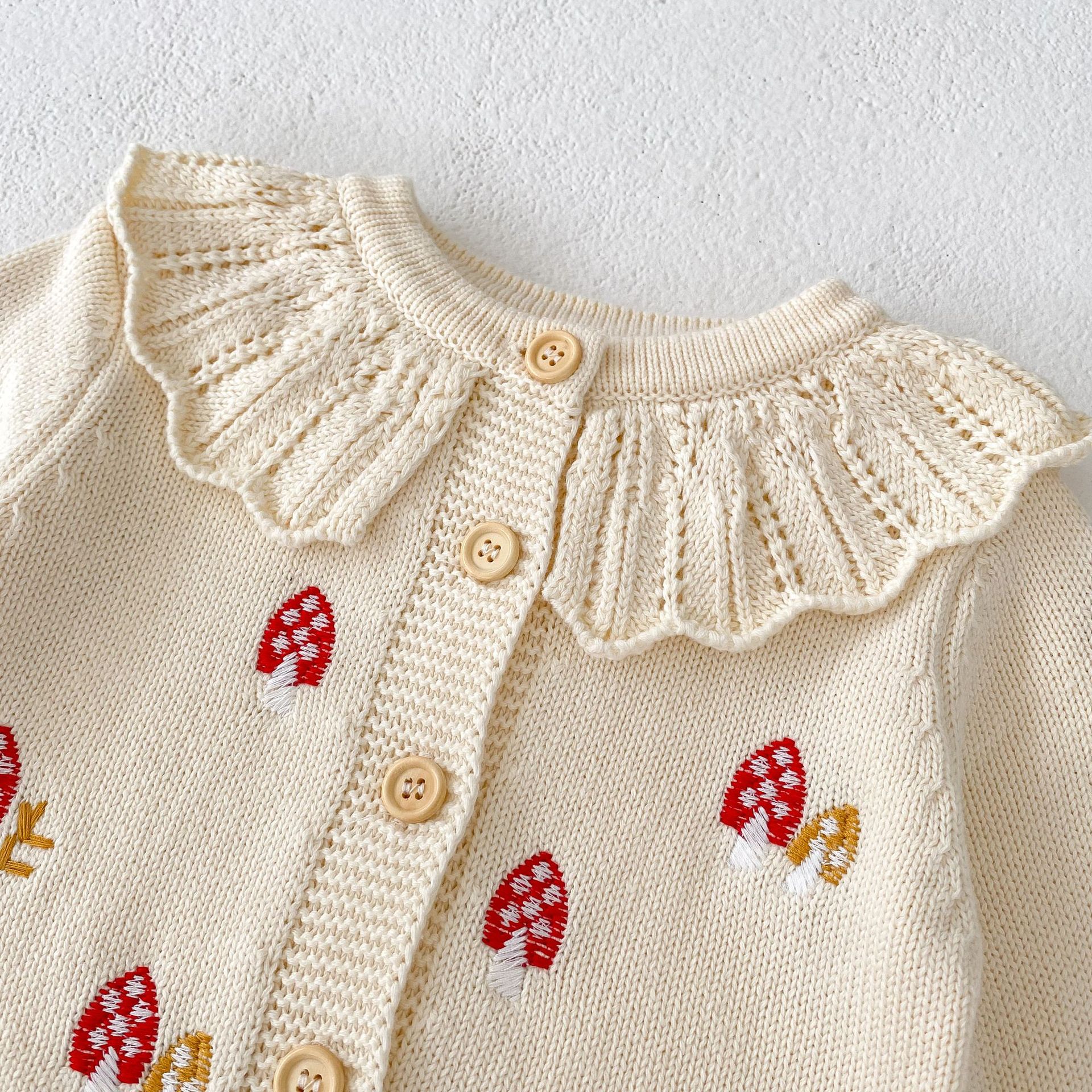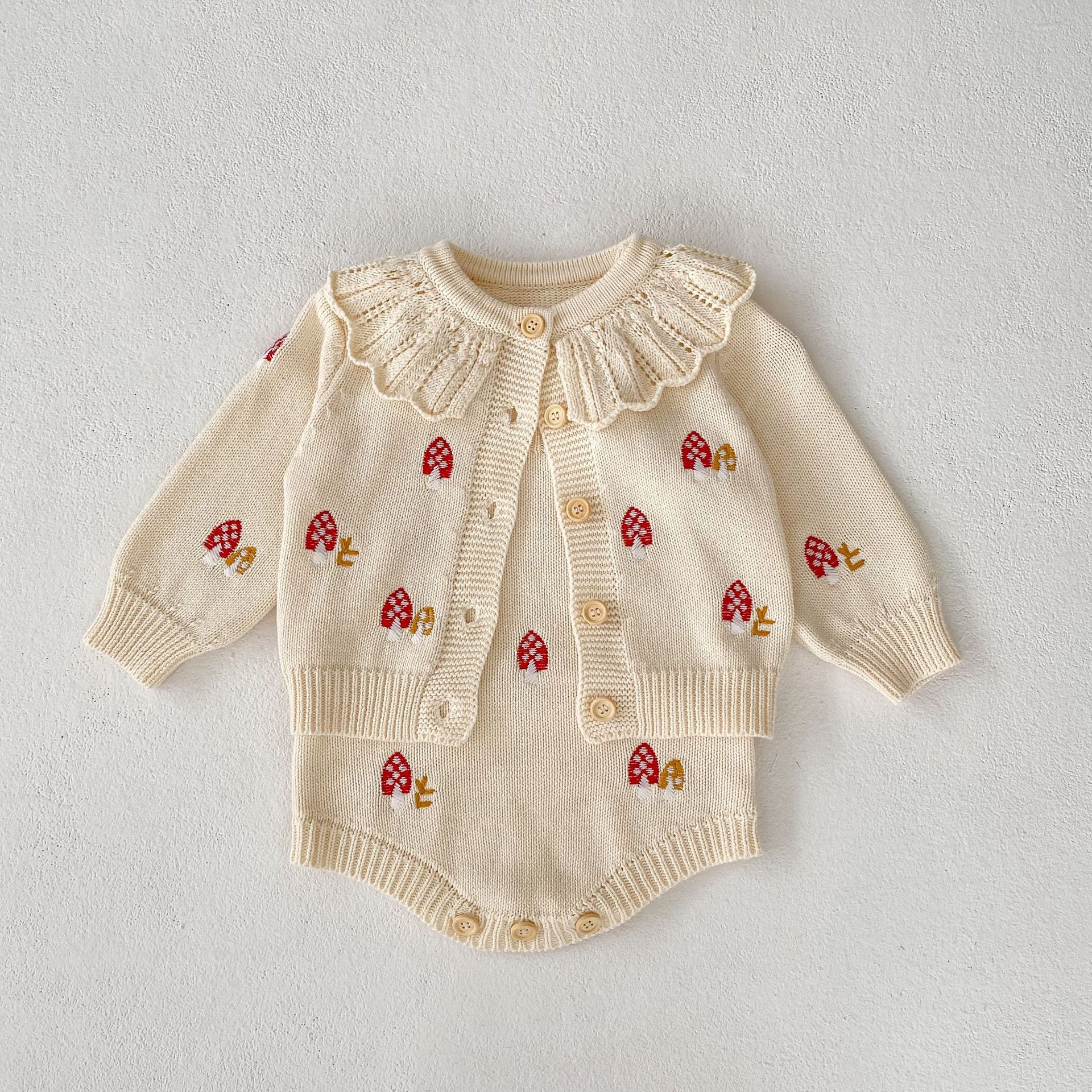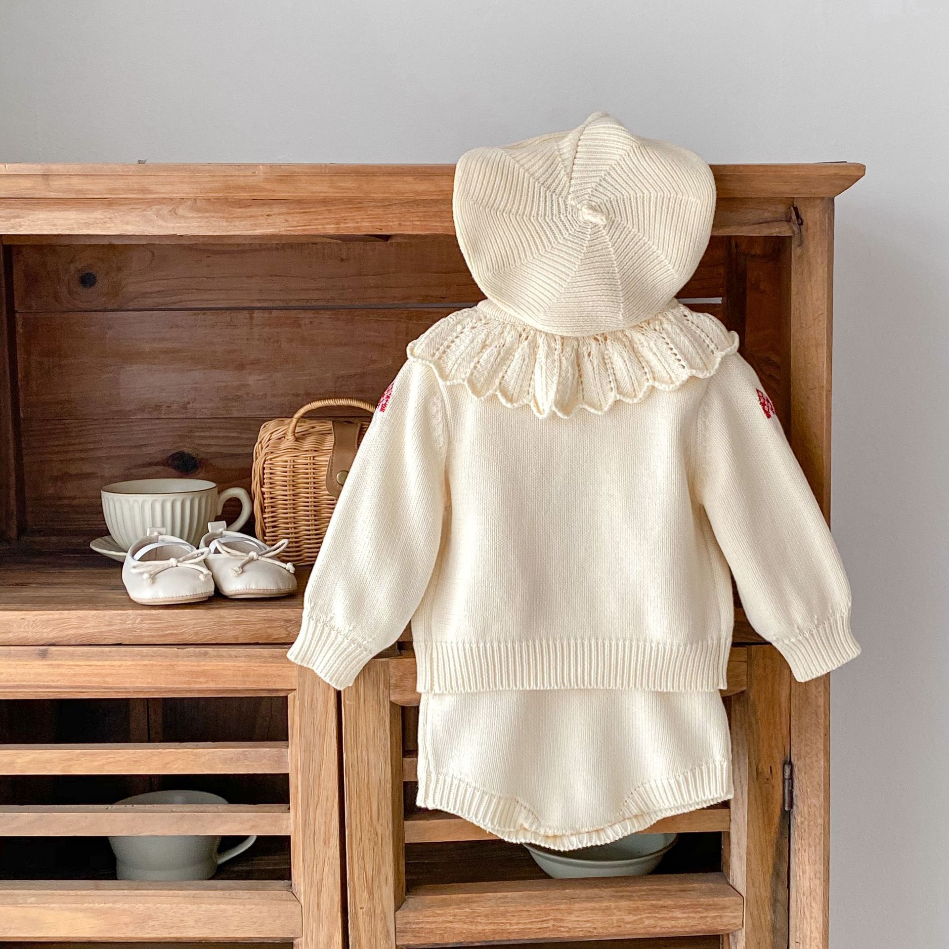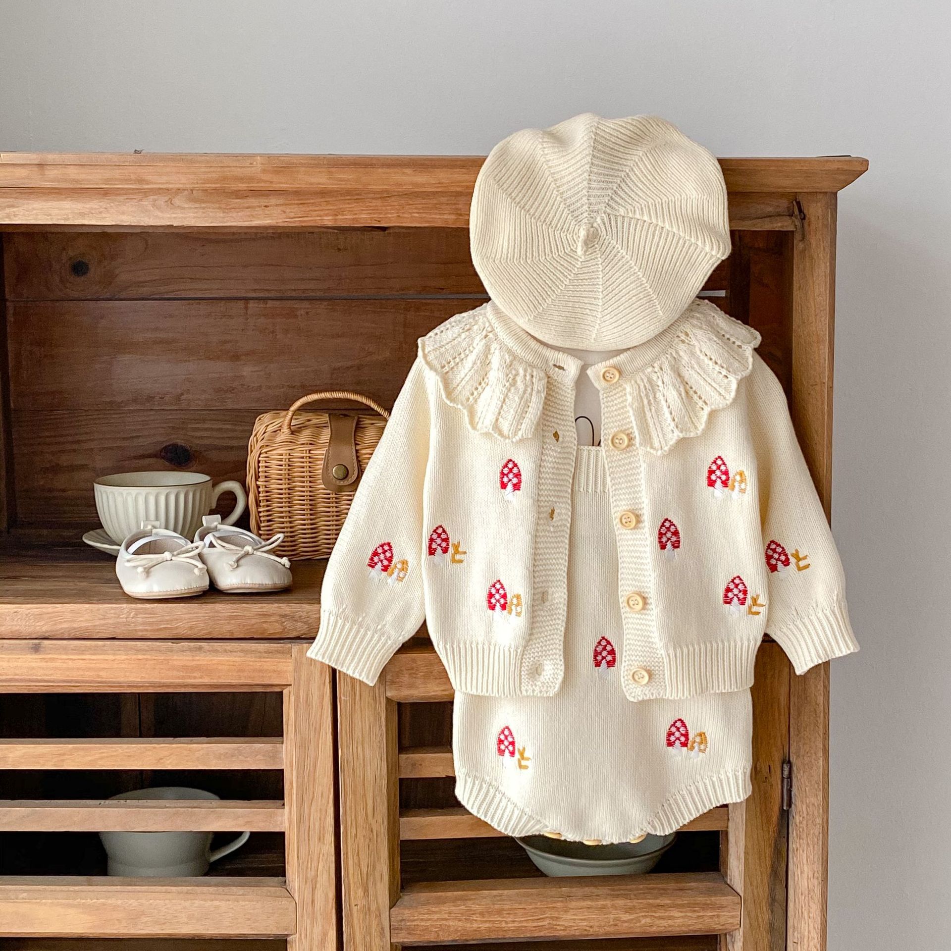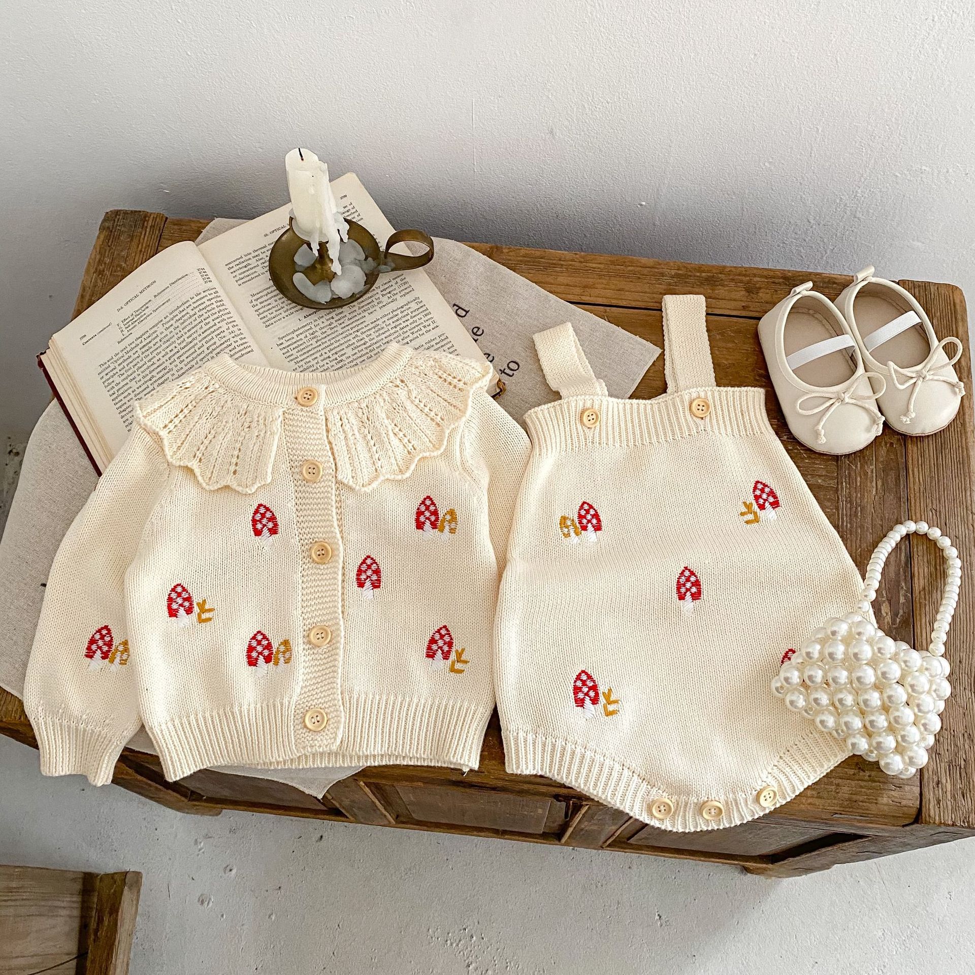2025 가을 의류 유아 및 어린이 여아 베이비 슈트 자수 연잎 칼라 니트 탑 + 서스펜더 2 피스 슈트스토어 가기