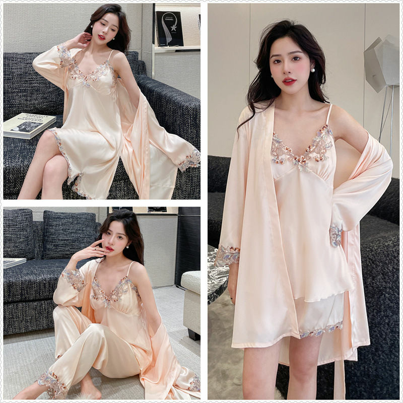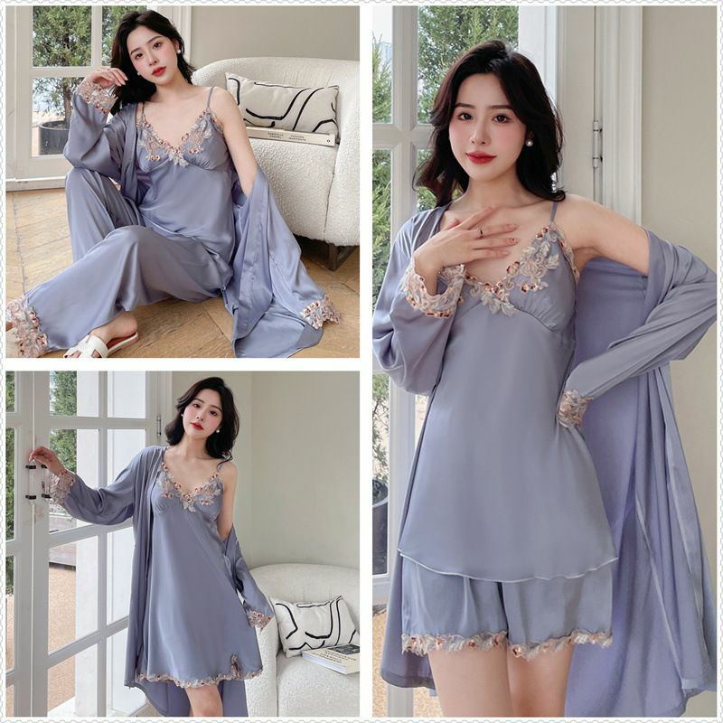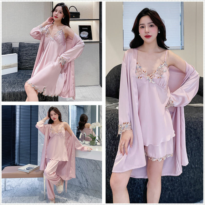 다채로운 레이스 잠옷 5 피스 세트 아이스 실크 잠옷 여성의 여름 가정 아침 가운 가슴 패드 다채로운 레이스 슬링