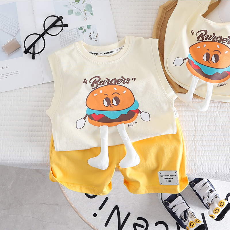 女童夏装套装2023年儿童男童背心短裤汉堡卡通韩版姐弟装两件套潮