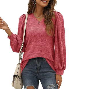2022年欧美女装亚马逊秋冬新品圆领T恤 灯笼袖打揽女士长袖上衣女
