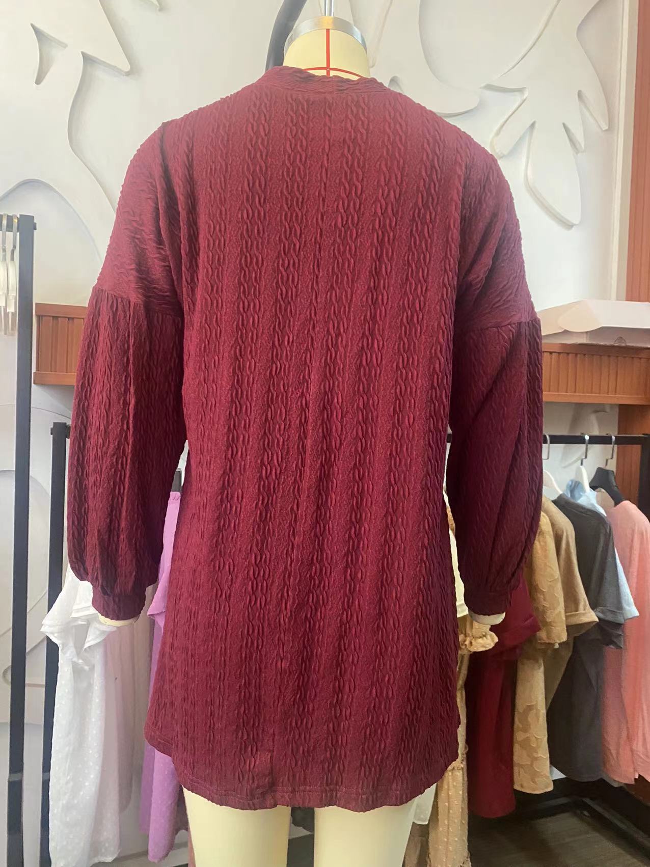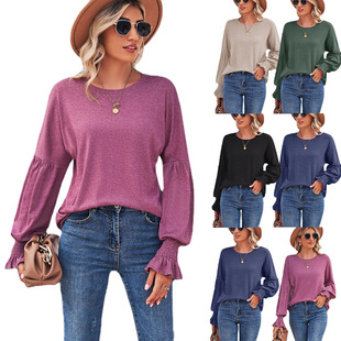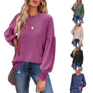 2023秋冬新跨境外贸亚马逊独立站T恤 圆领宽松袖口打揽灯笼袖上衣