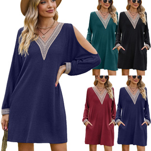 现货2023秋冬季新款欧美跨境亚马逊独立站连衣裙 V领花边露肩裙子