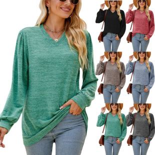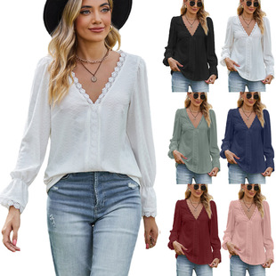 亚马逊2023欧美跨境外贸秋冬新款纯色花边拼接V领长袖宽松T恤上衣