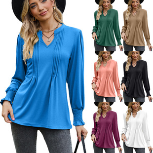 2023亚马逊秋季新款t恤 跨境女装纯色拉条泡泡袖V领打揽长袖上衣