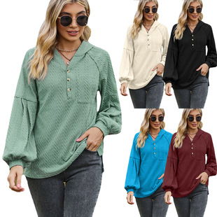 2022年秋冬新款亚马逊爆品T恤 欧美外贸休闲泡泡袖V领长袖打底衫
