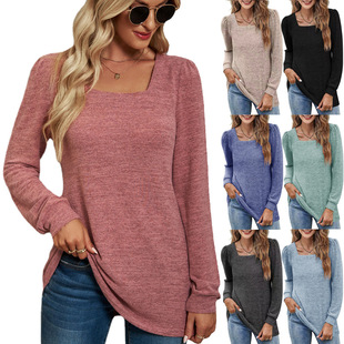 2023年秋冬新款亚马逊爆品T恤 纯色方领皱褶长袖休闲女式打底女