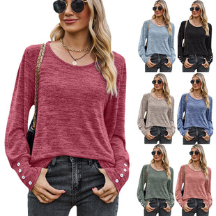 蔻楚2023跨境秋冬新款外贸女装 亚马逊爆品圆领纽扣开叉T恤上衣女