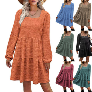 2022秋季跨境欧美新款亚马逊连衣裙 方领耸肩长袖女式分层拼接裙