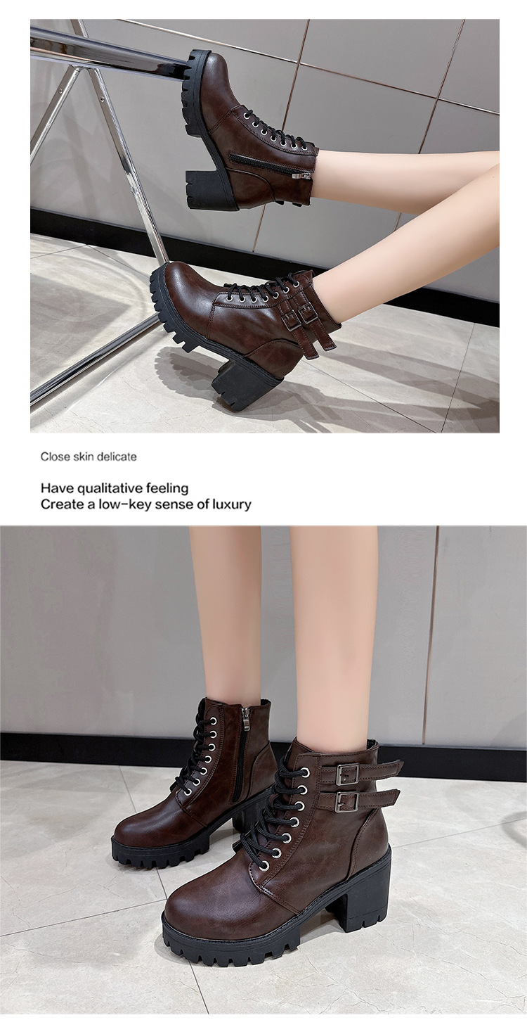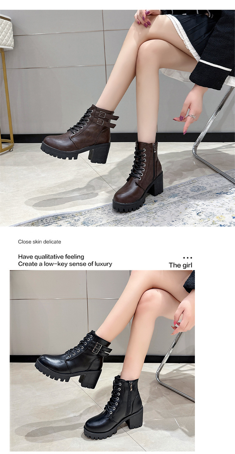 부츠 여성용 2023 유럽과 미국 가을 새로운 레이스 업 블랙 마틴 부츠 라운드 토 두꺼운 굽 미드 힐 벨트 버클 여성용 짧은 부츠스토어 가기