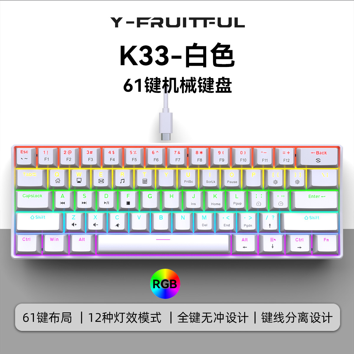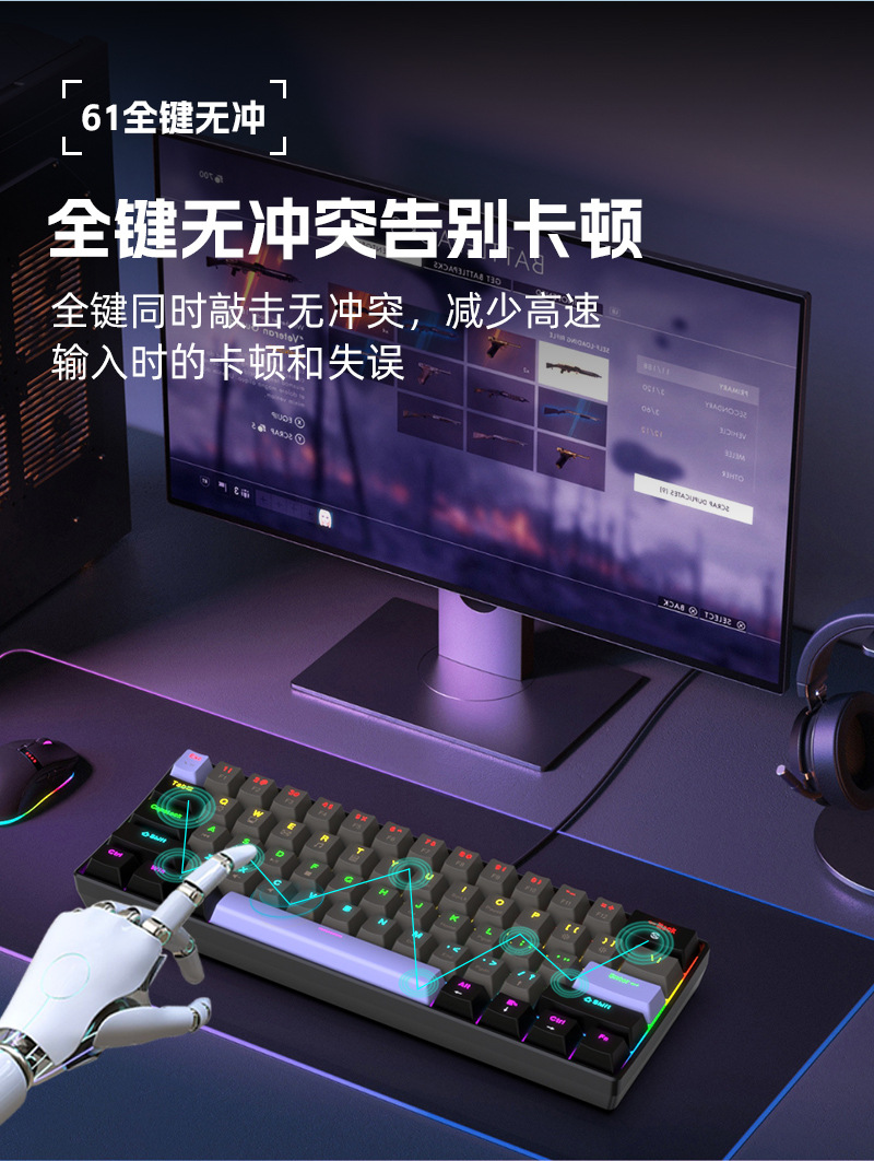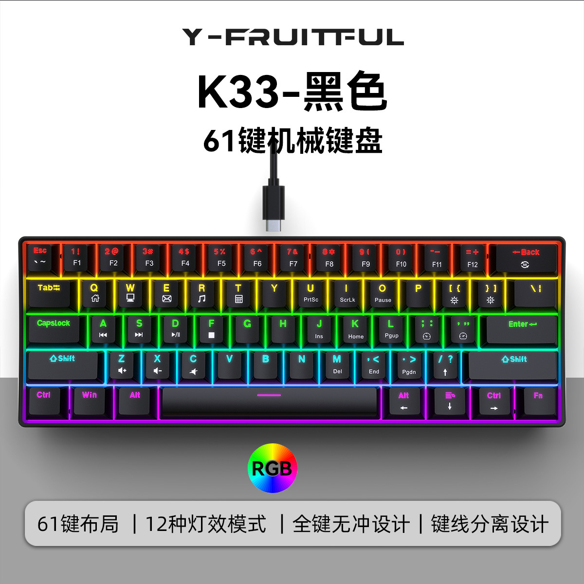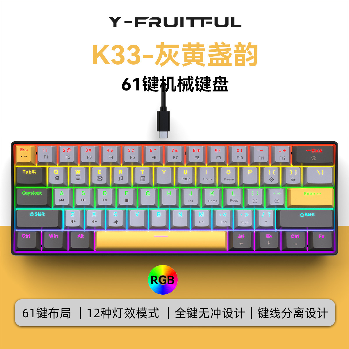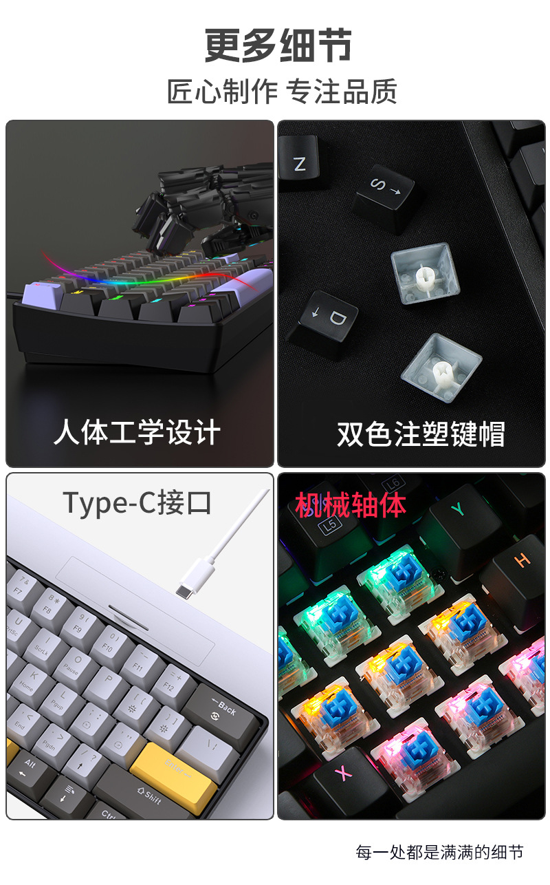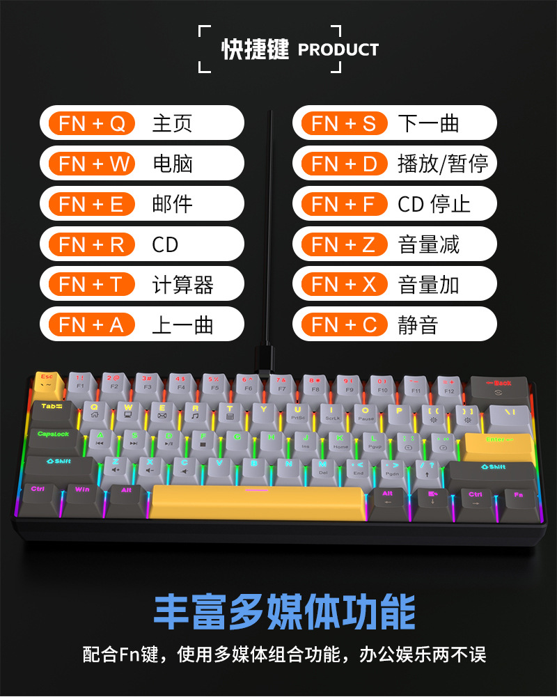 Yun Guo K33 e 스포츠 유선 기계식 키보드 플러그 가능 61 키 발광 녹색 샤프트 기계식 키보드 컴퓨터 액세서리스토어 가기
