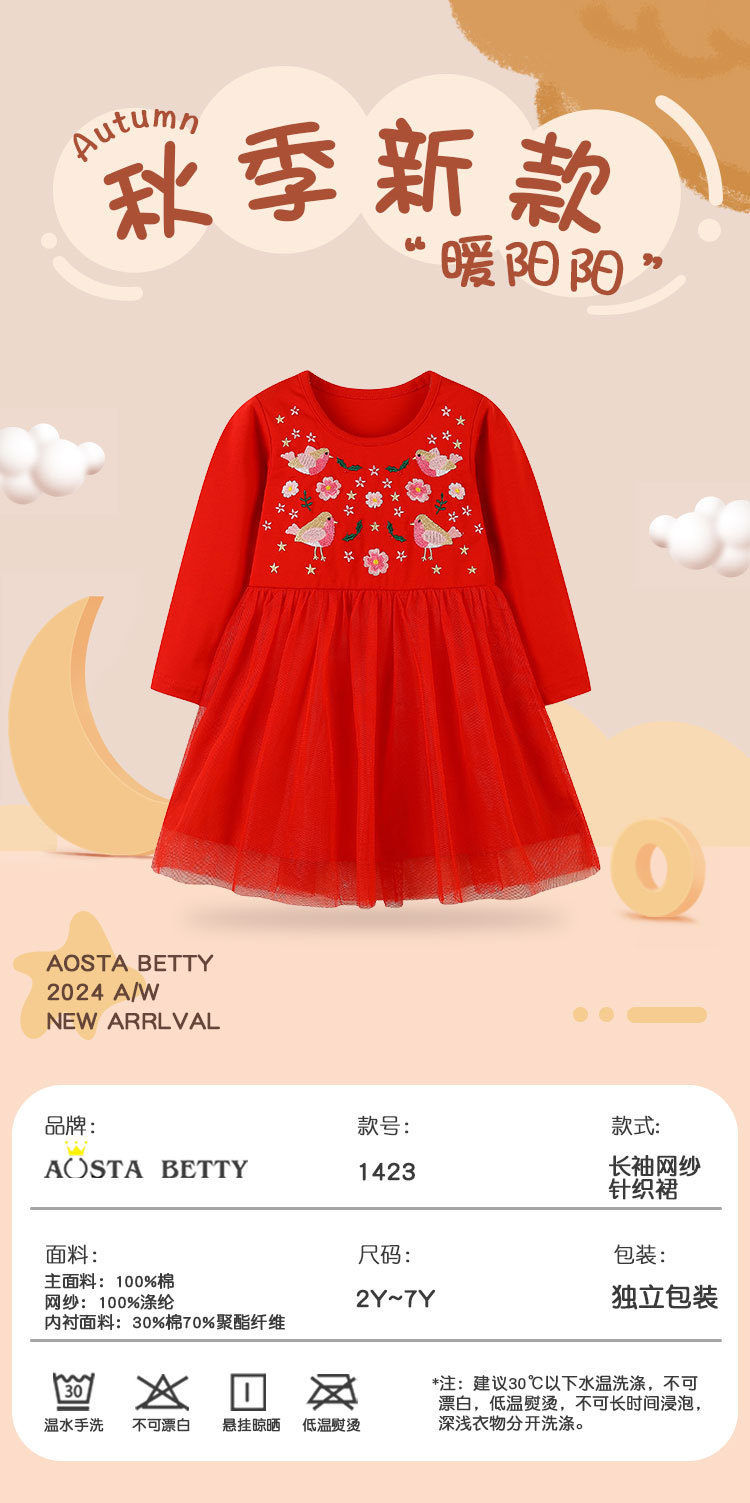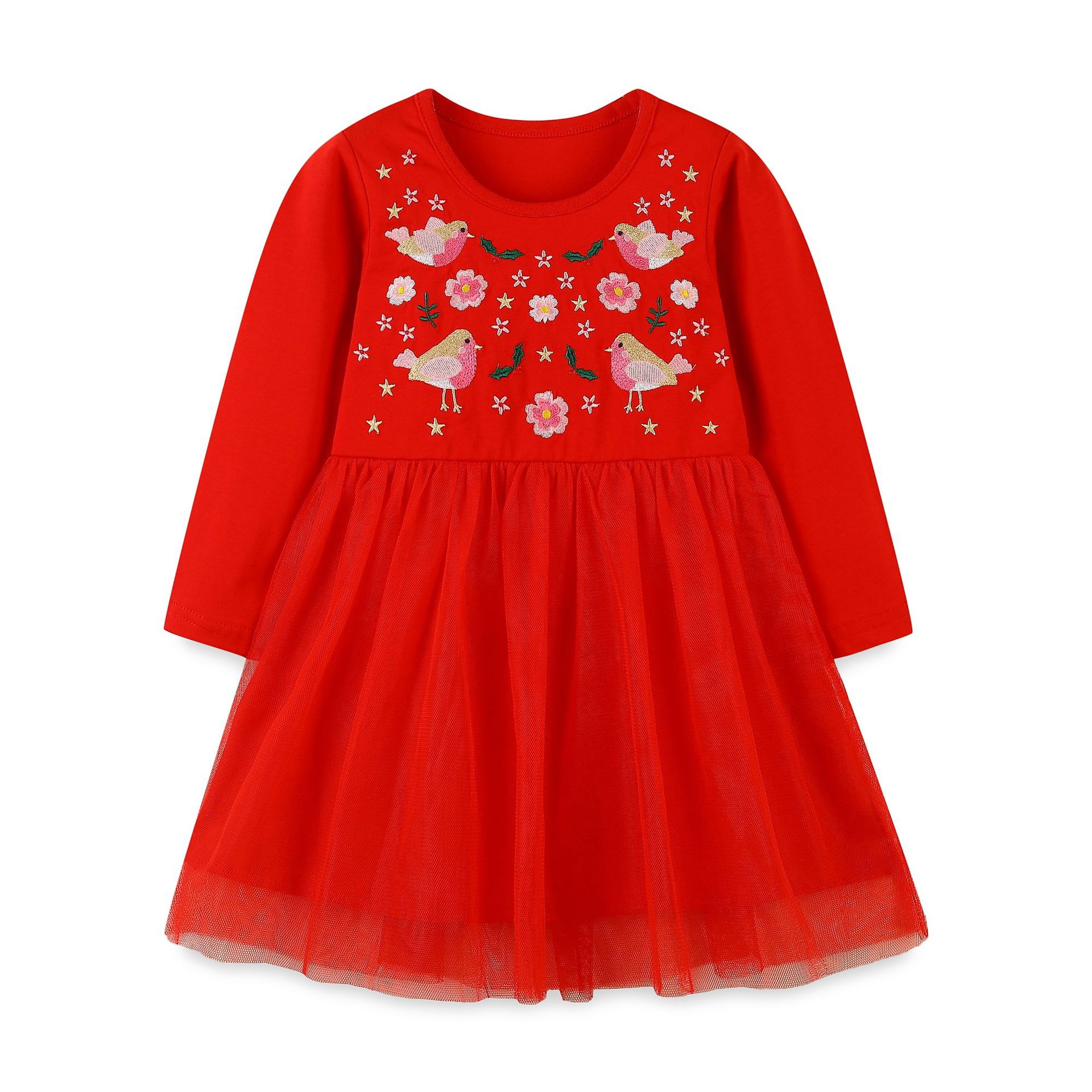 가을 새 여자 드레스 귀여운 수 놓은 패턴 아동 의류 유럽과 미국 스타일의 메쉬 공주 드레스 드롭 배송