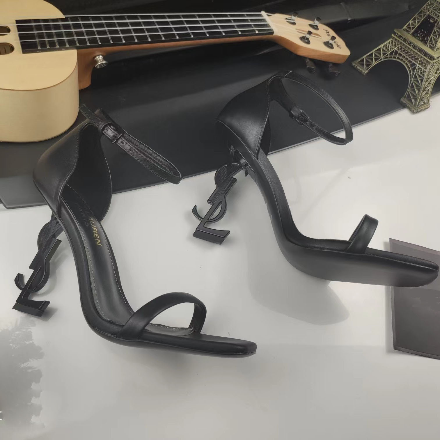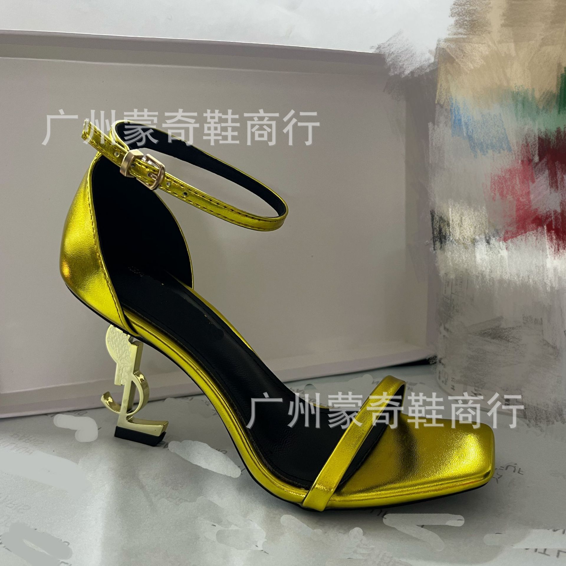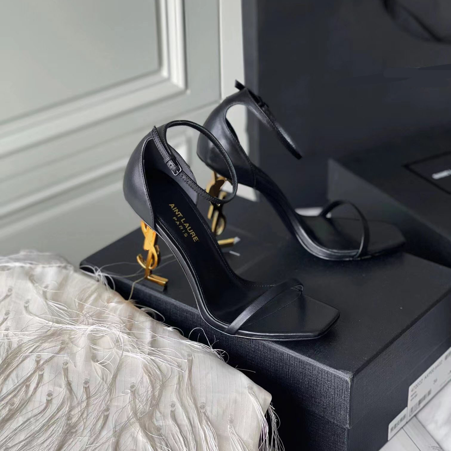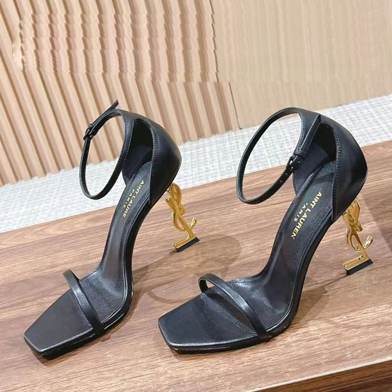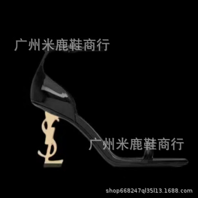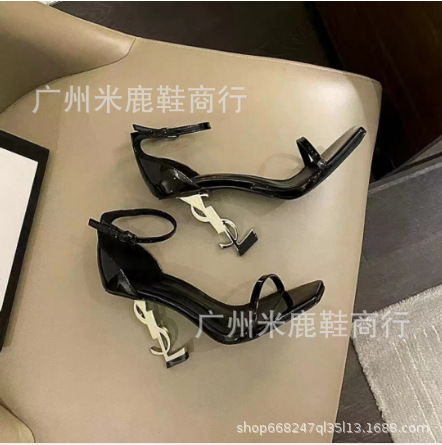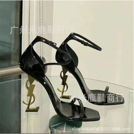 2023YS 숲 같은 스타일 블랙 에나멜 가죽 섹시한 한 단어 하이힐 샌들 금속 문자 여성 연예인 스타일스토어 가기