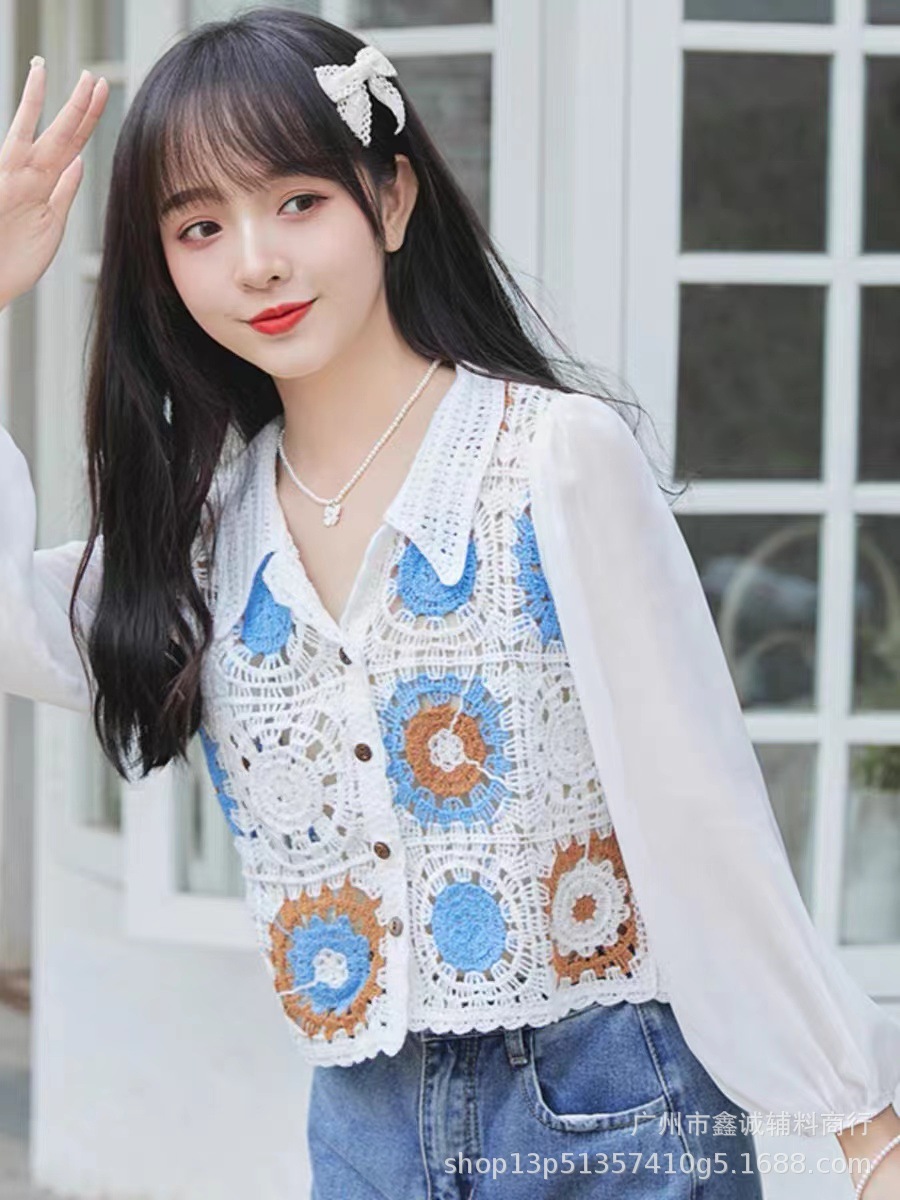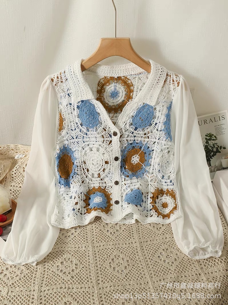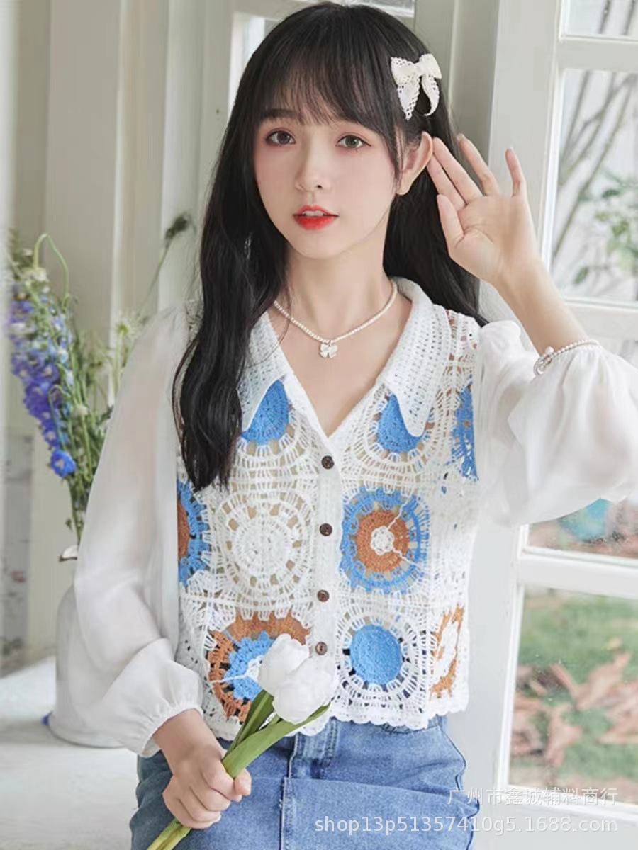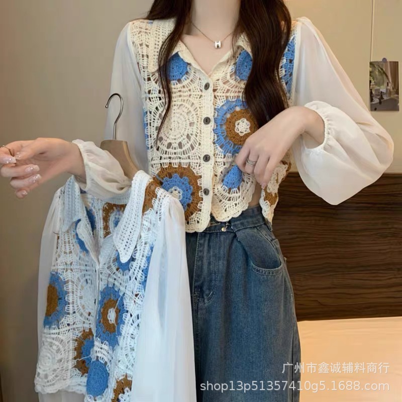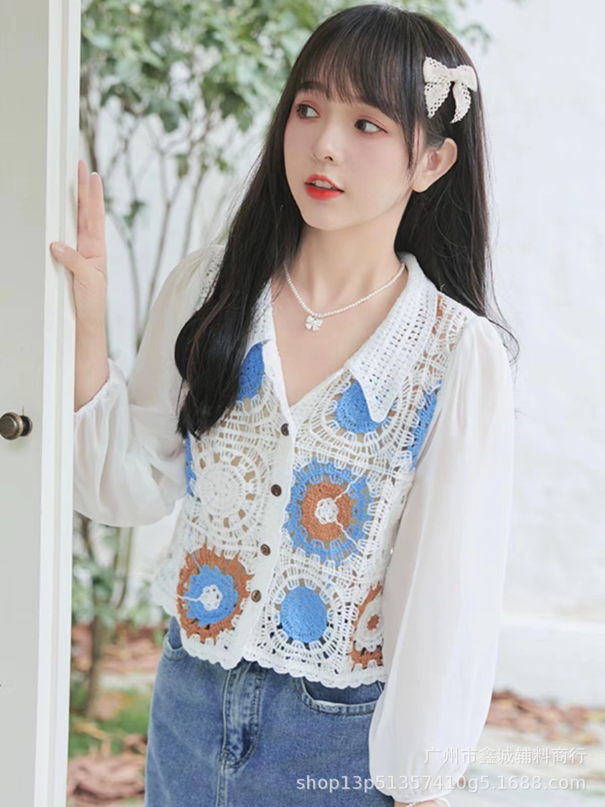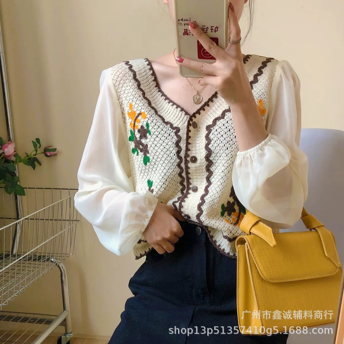 한국 스타일 복고풍 달콤한 크로 셰 뜨개질 중공 쉬폰 셔츠 여자의 여름 대학 스타일 디자인 감각 틈새 짧은 탑 유행