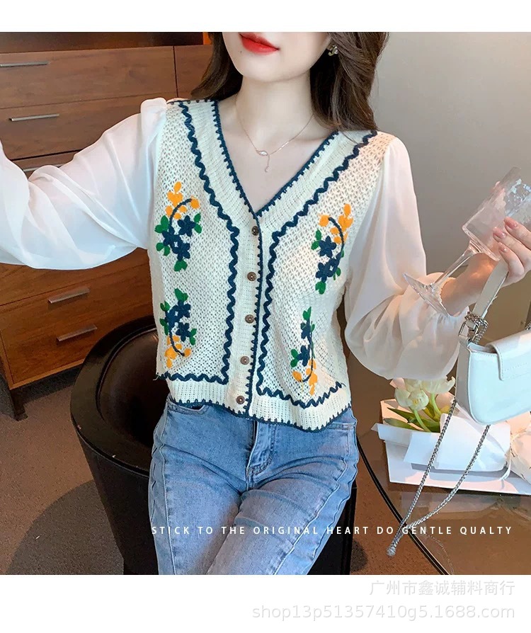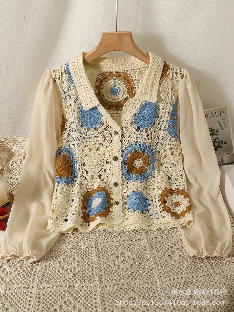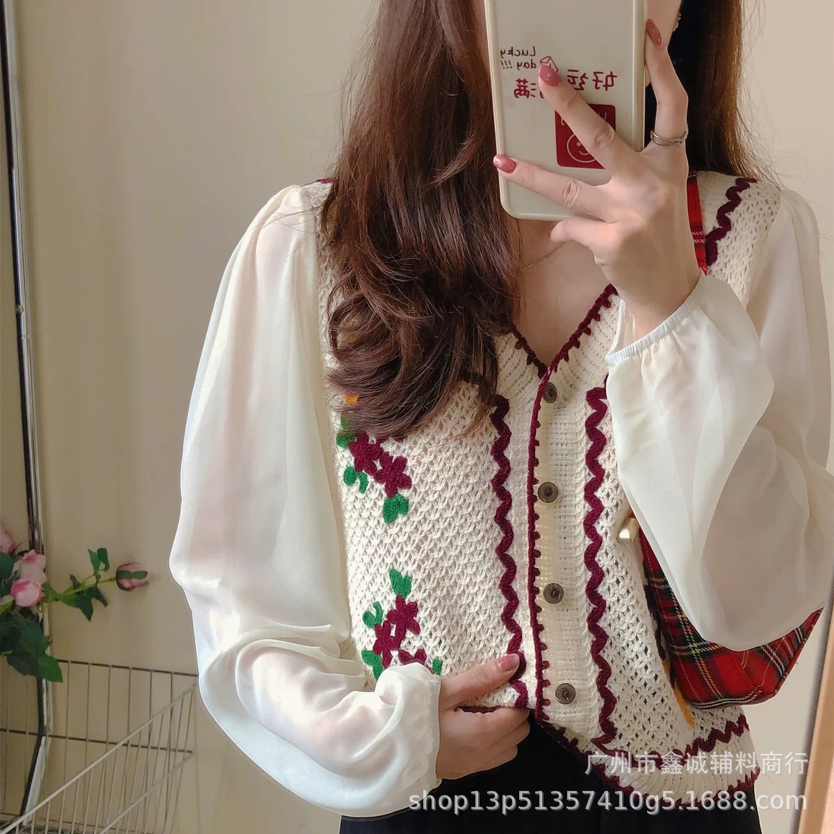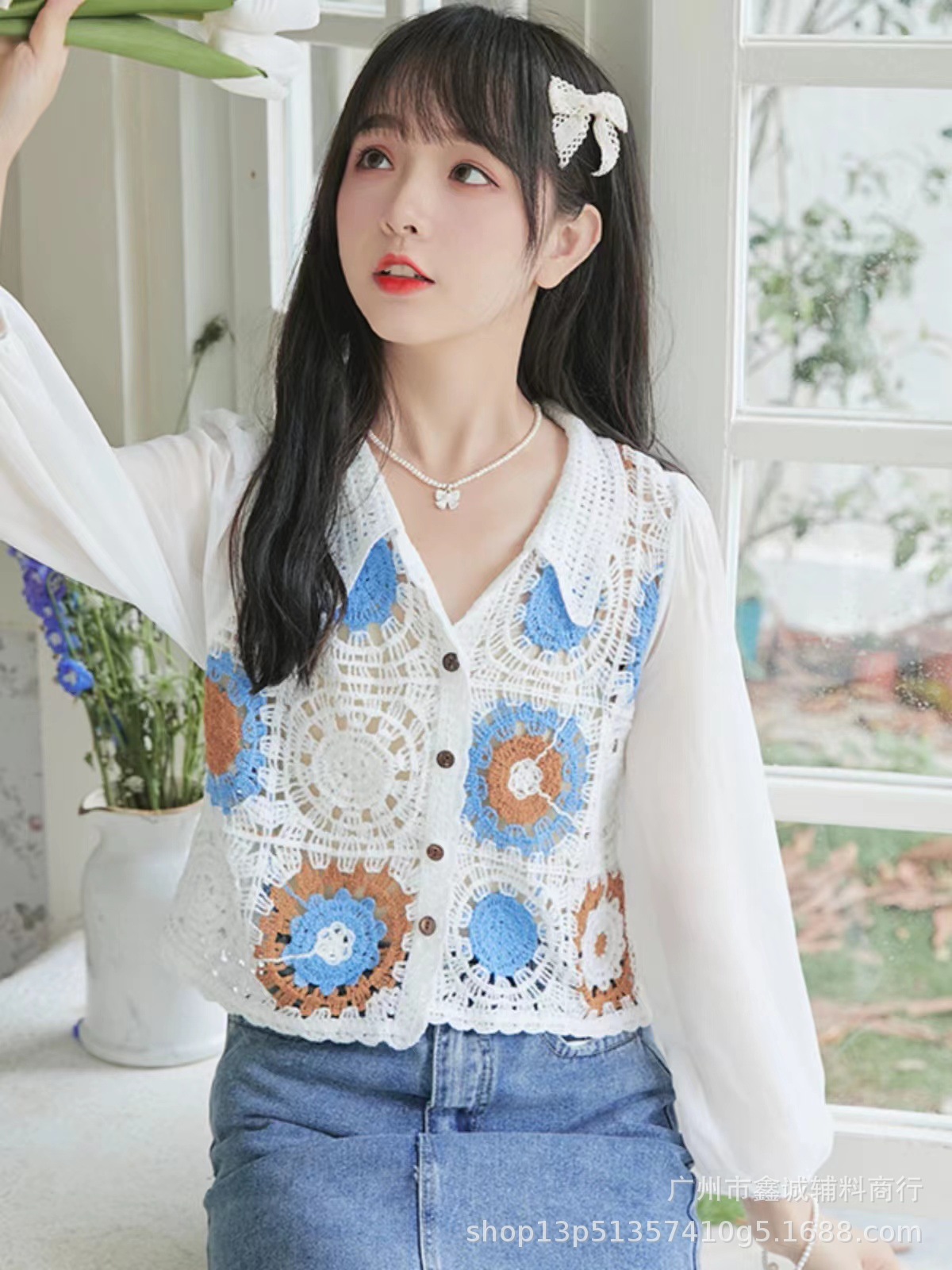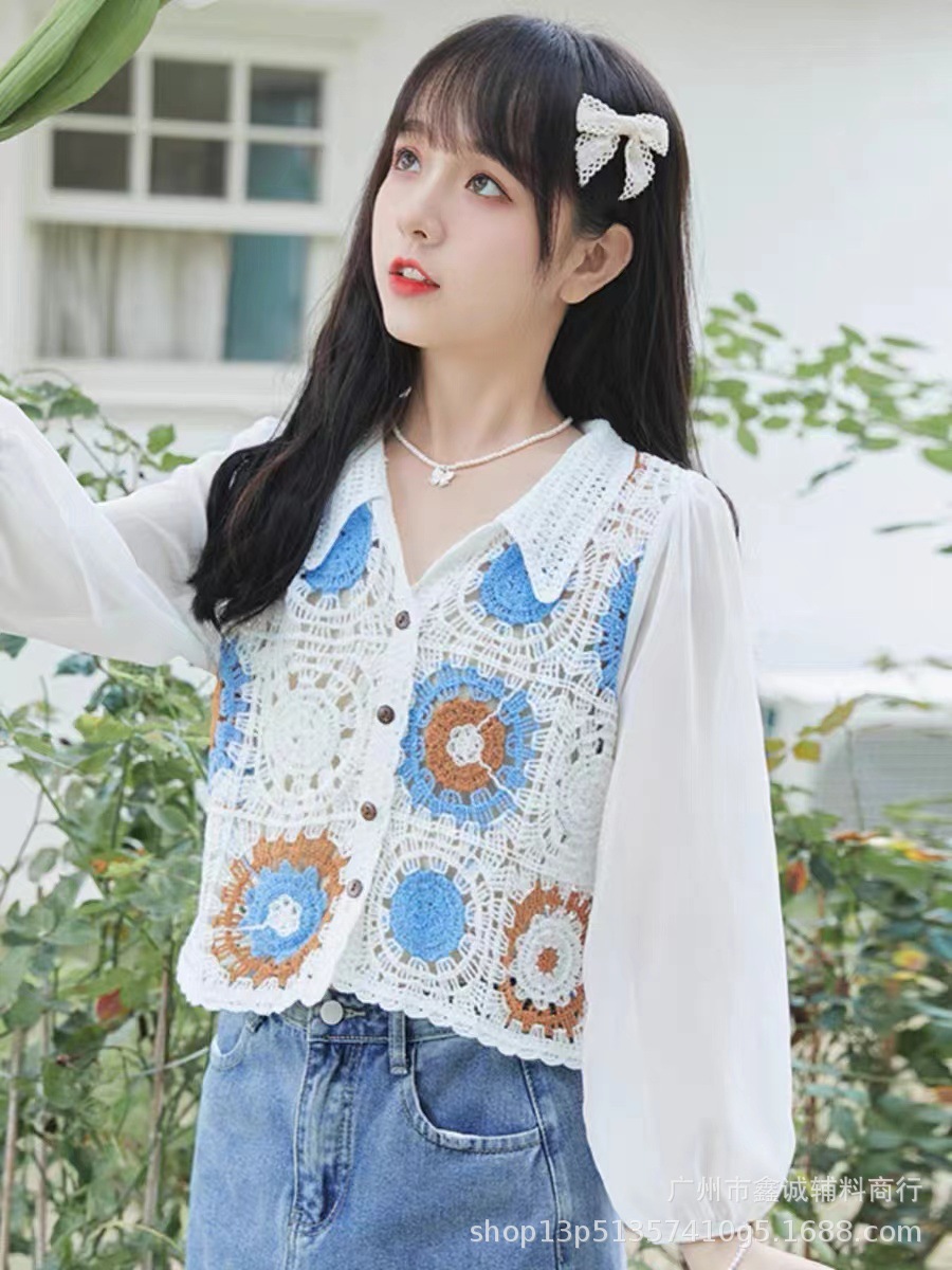 한국 스타일 복고풍 달콤한 크로 셰 뜨개질 중공 쉬폰 셔츠 여자의 여름 대학 스타일 디자인 감각 틈새 짧은 탑 유행