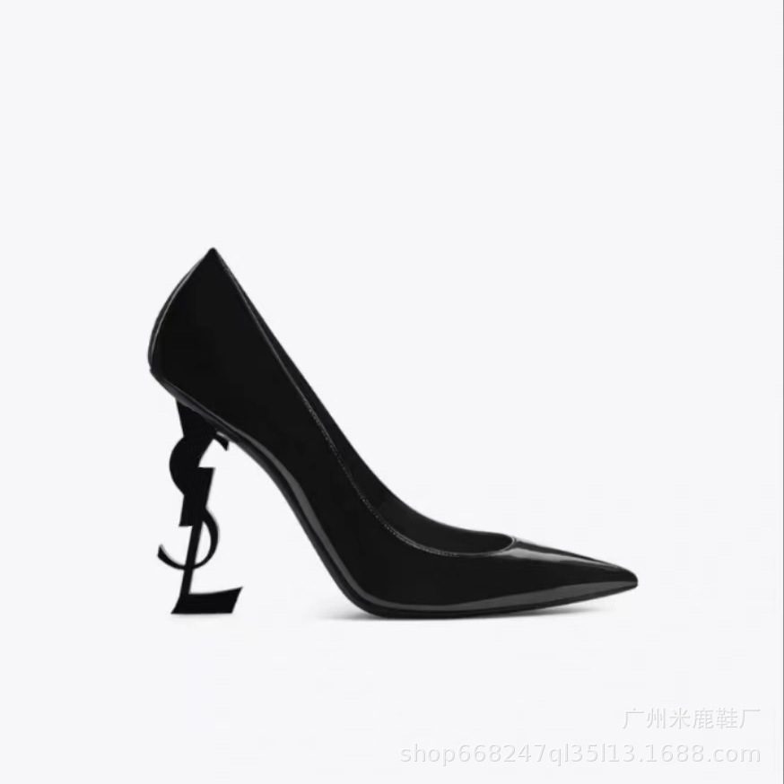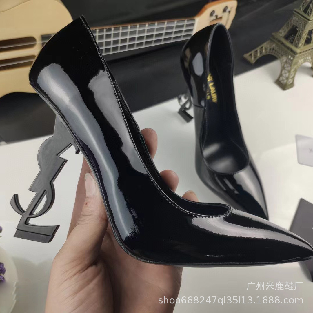 프렌치 스타일 YS 싱글 레이어 슈즈 블랙 에나멜 가죽 신상품 사이버 연예인 모든 경기 편지 얕은 입 뾰족한 사교계 하이힐 여성용