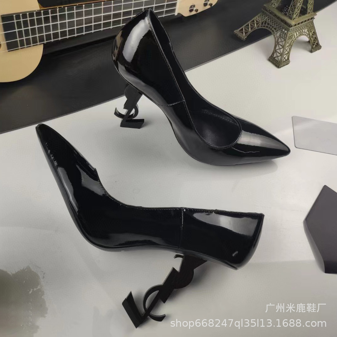 프렌치 스타일 YS 싱글 레이어 슈즈 블랙 에나멜 가죽 신상품 사이버 연예인 모든 경기 편지 얕은 입 뾰족한 사교계 하이힐 여성용스토어 가기