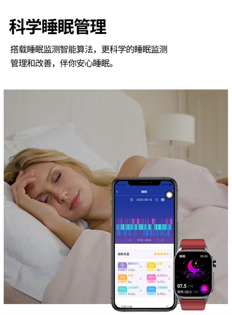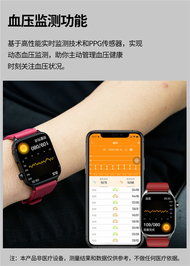 功能卖点 | ECG心电图功能,2.04英寸超视网膜368*448全触摸屏,蓝牙通话,无创血糖测量,血液成分测量(尿酸血脂功能),身体成分BMI体脂测量,HRV功能,AI医疗诊断,梅脱功能,SOS紧急呼叫功能,体温监测,血氧监测,血压监测,呼吸训练、压力监测,女性健康(经期跟踪),心率监测,血压监测,睡眠监测、久坐提醒等健康功能。 计步/卡路里/距离,多运动模式,闹钟,息屏显示功能,天气预报,智能语音助手,游戏,手电筒,音乐播放和控制, APP:Hband. |