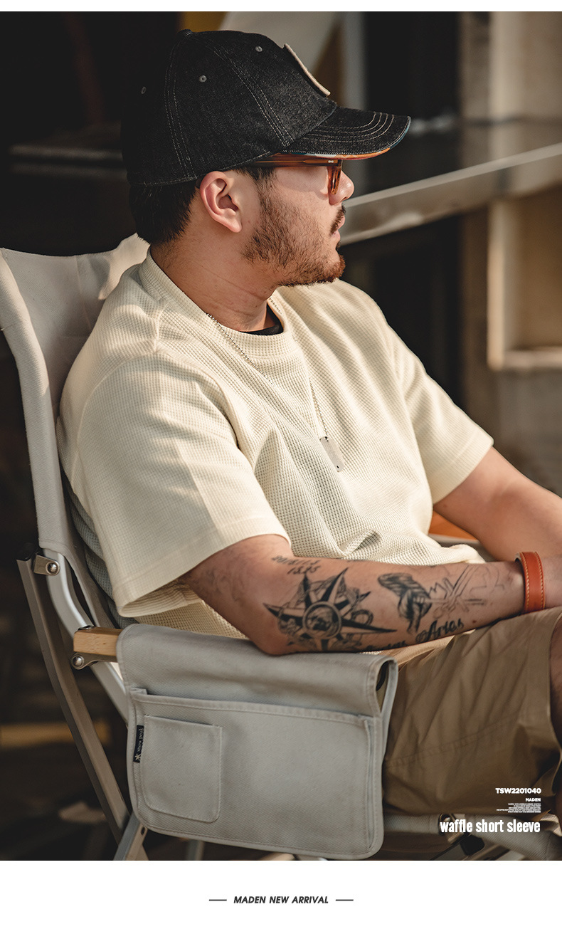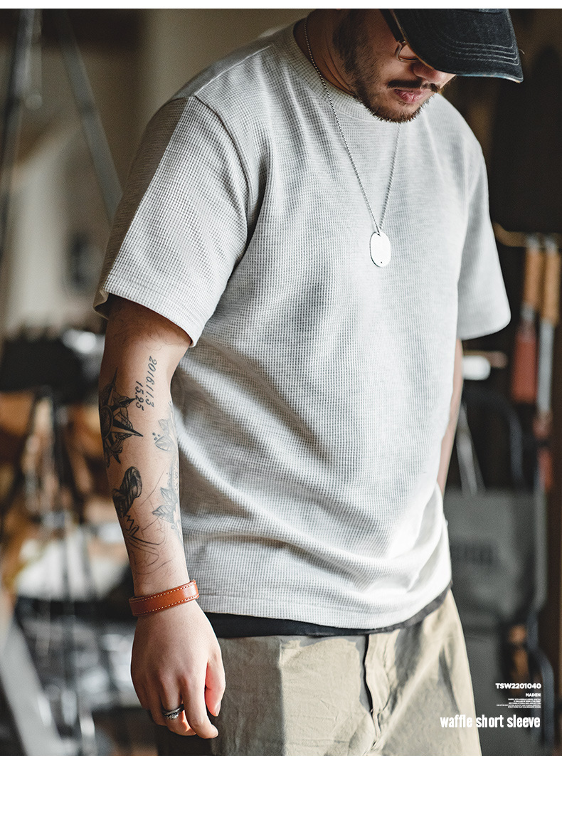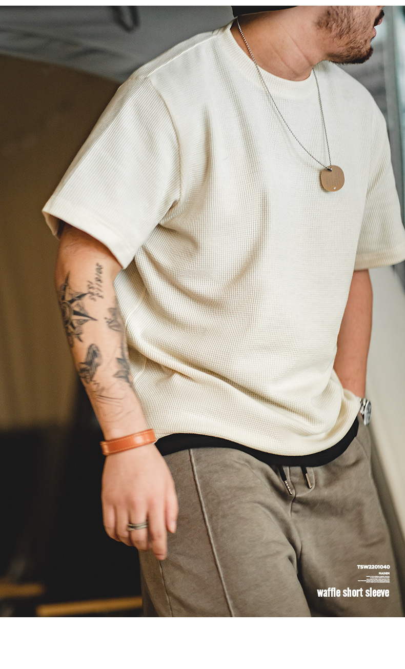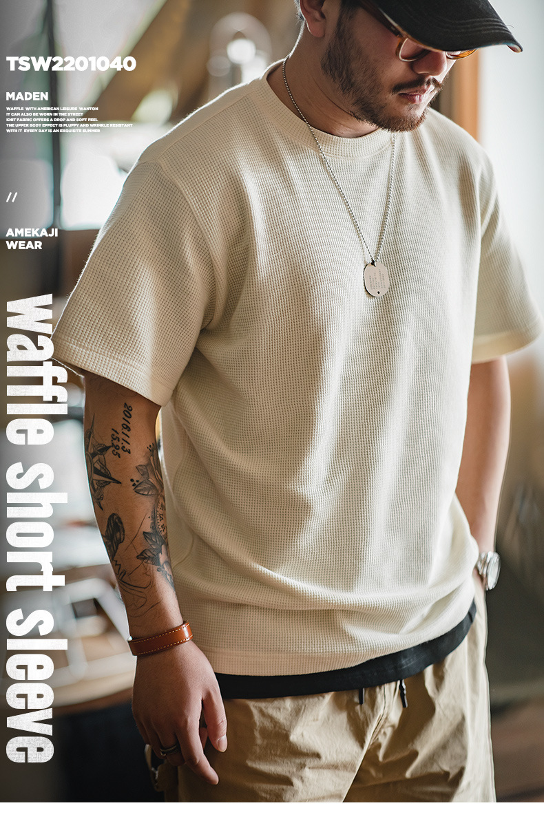 Madden Workwear 아메리칸 오프화이트 와플 티셔츠 니트 오른쪽 어깨 헤비 워시드 머니 스타일 티셔츠 반팔 남성 여름스토어 가기