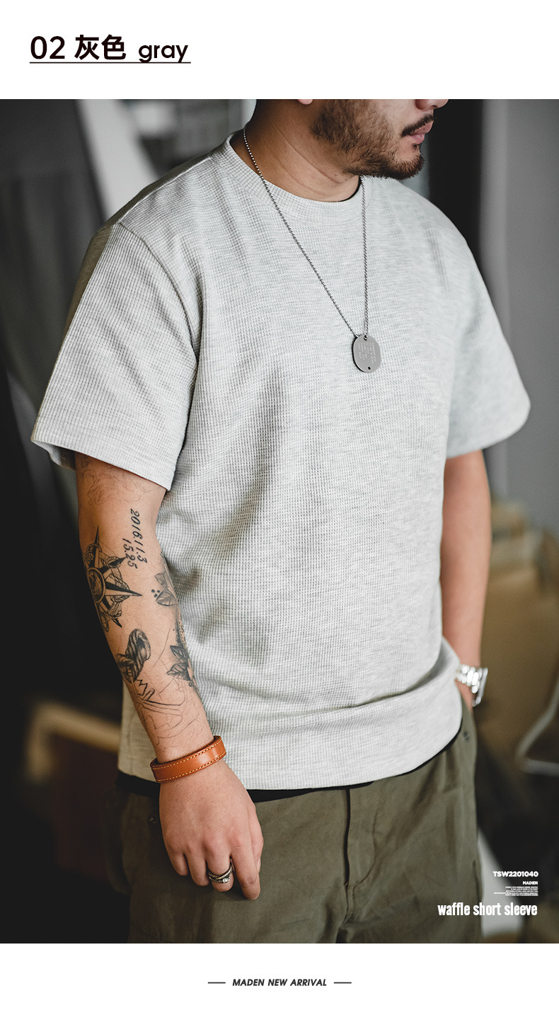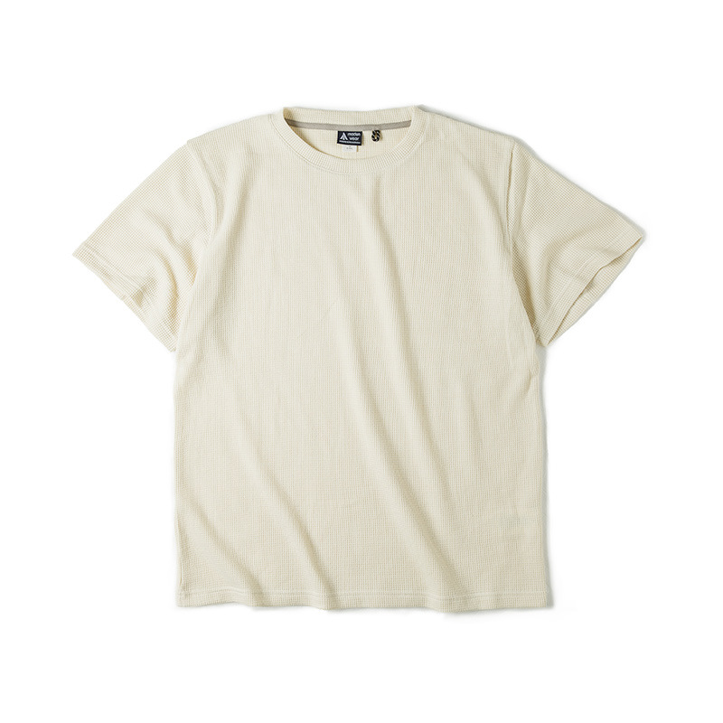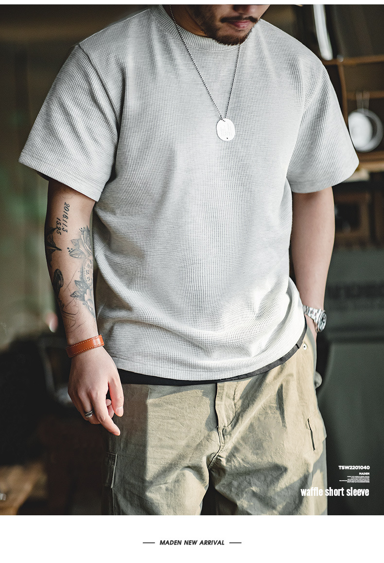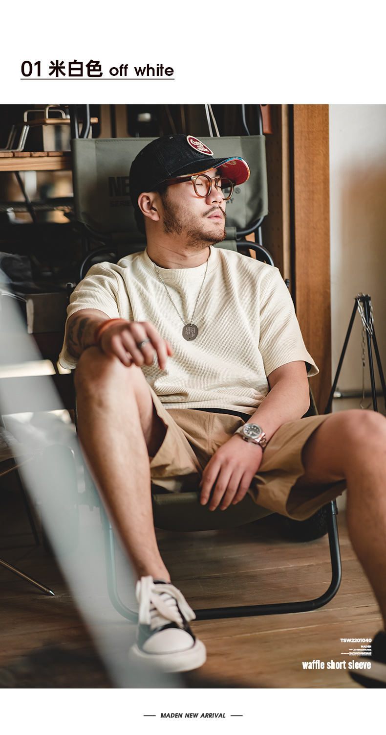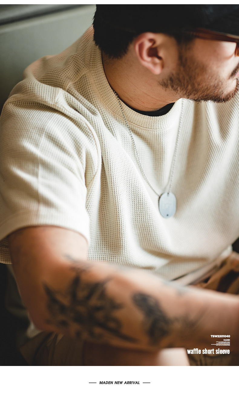 Madden Workwear 아메리칸 오프화이트 와플 티셔츠 니트 오른쪽 어깨 헤비 워시드 머니 스타일 티셔츠 반팔 남성 여름스토어 가기