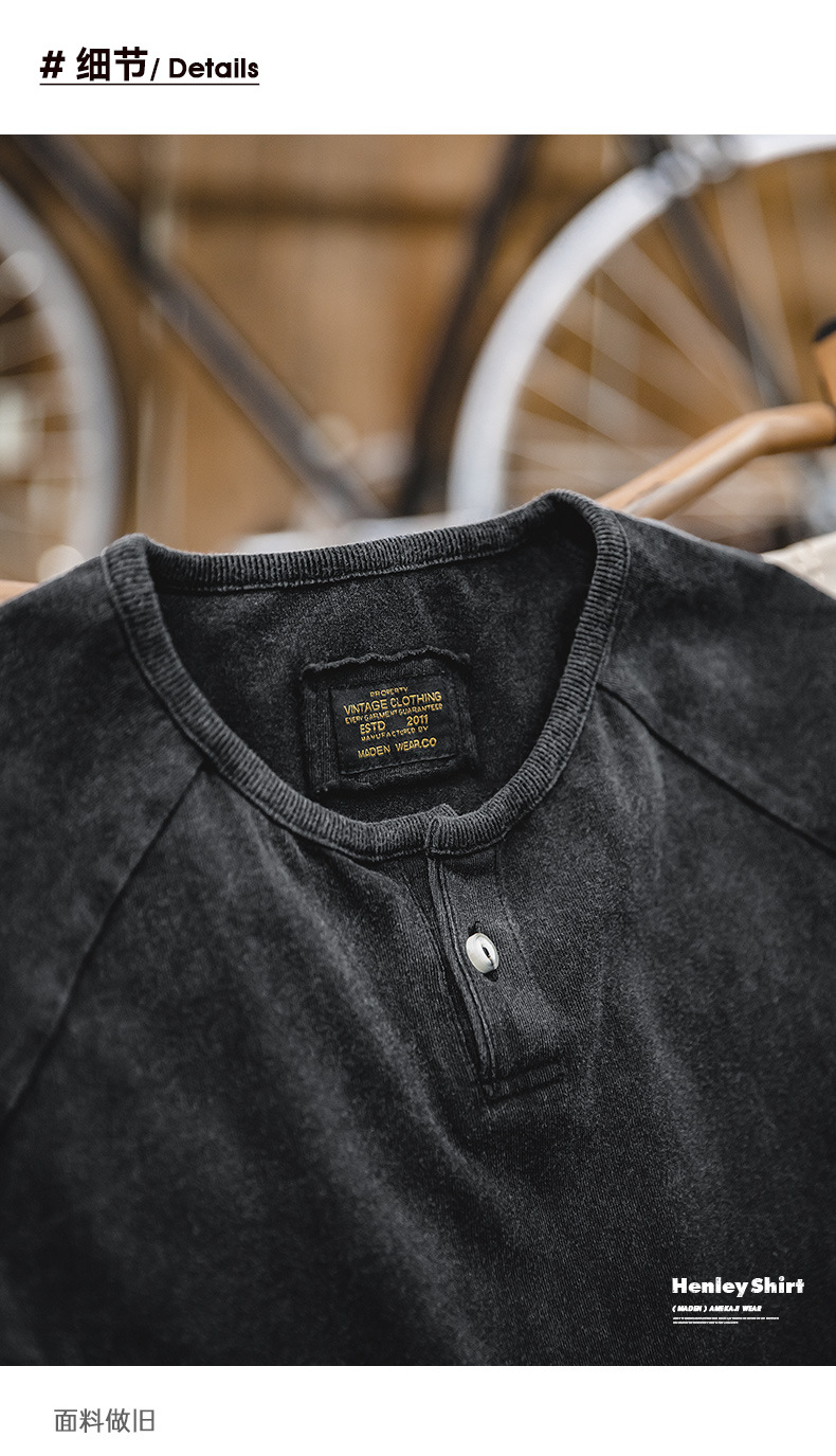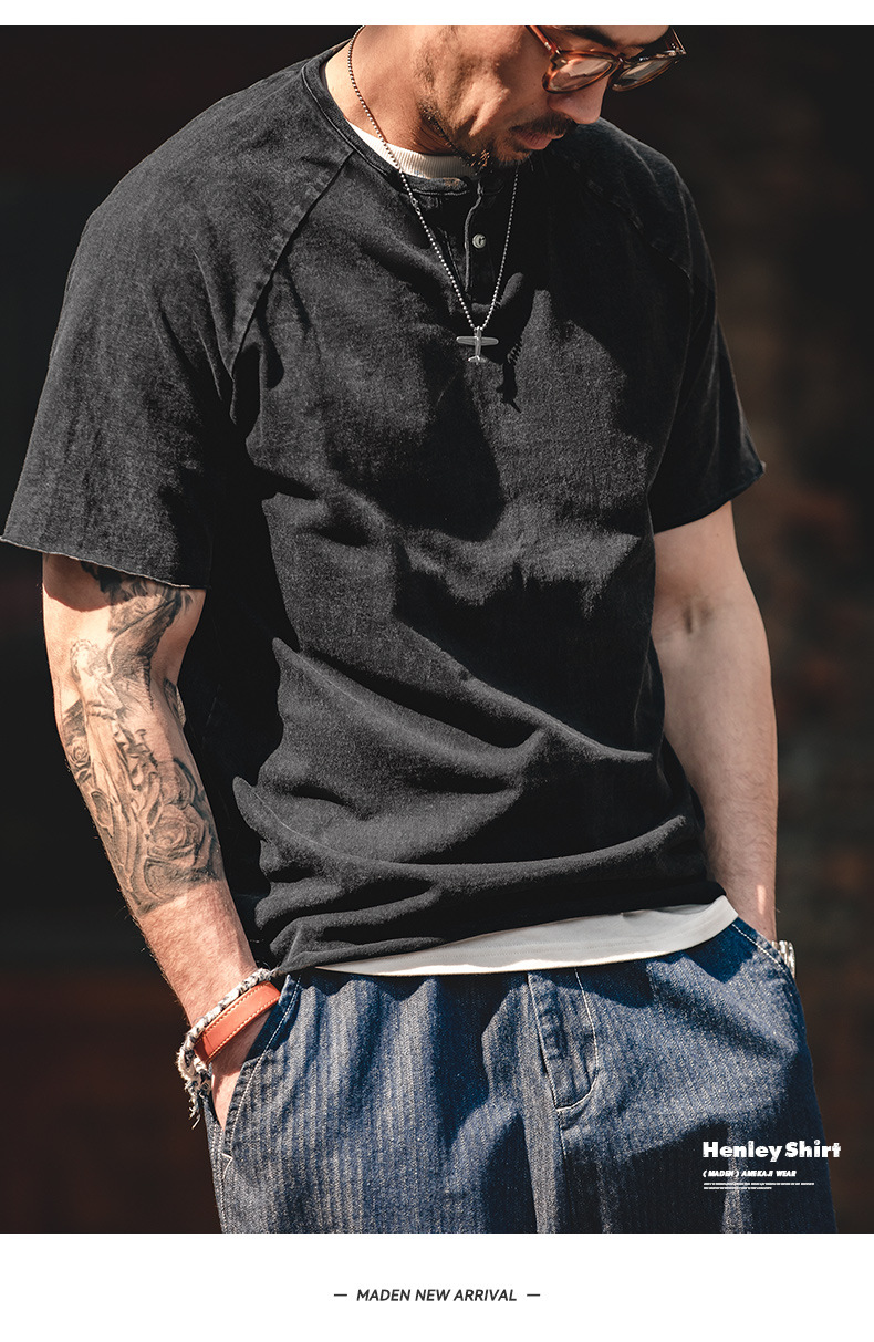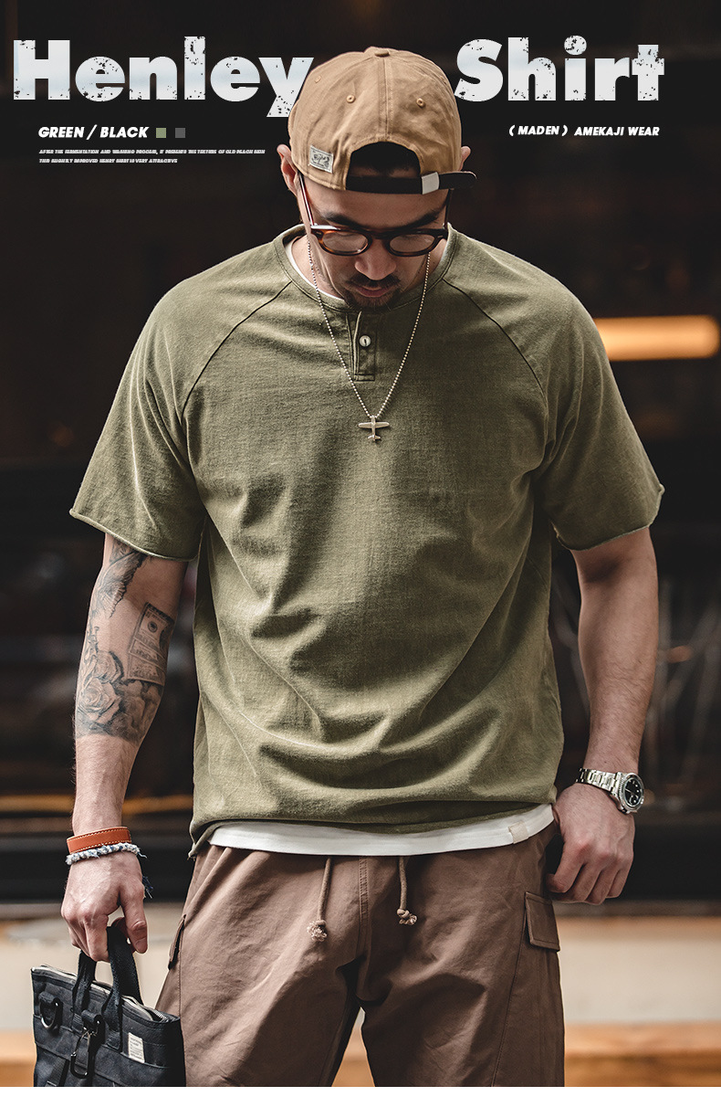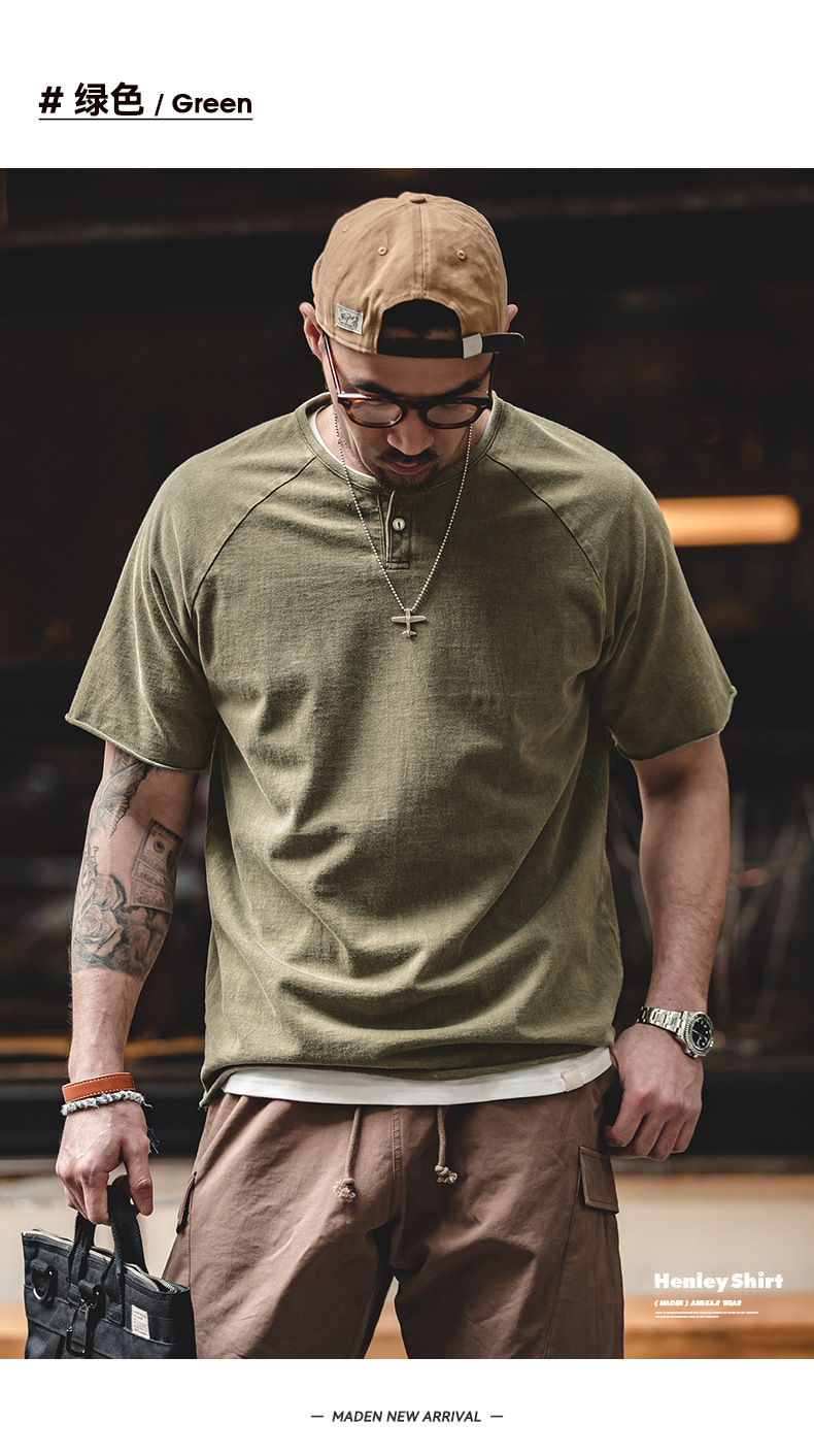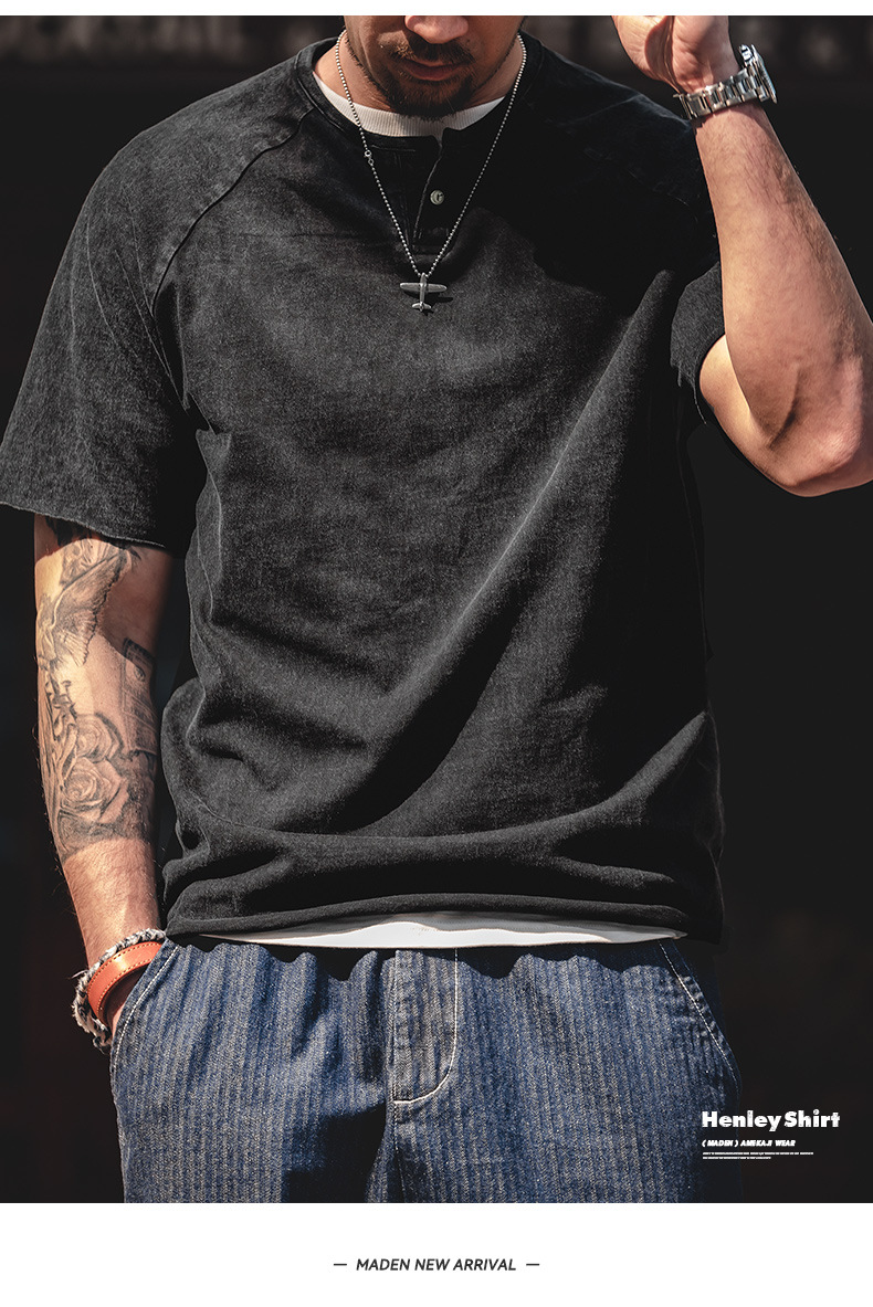 Marden 작업복 복고풍 헨리 칼라 스트레치 슬림 핏 반팔 Kaji 미국 터프가이 티셔츠 남자 여름스토어 가기