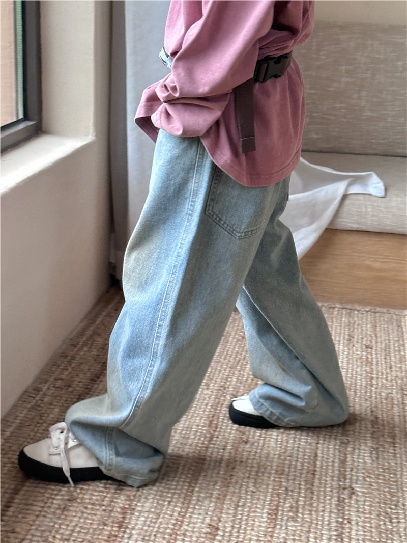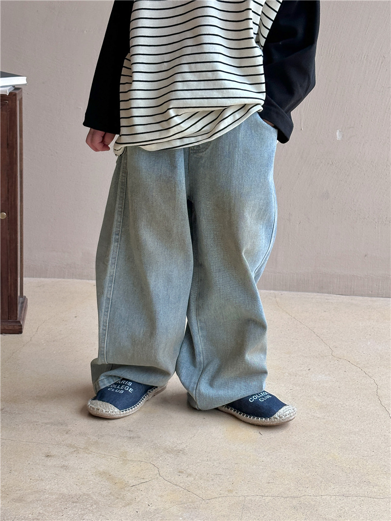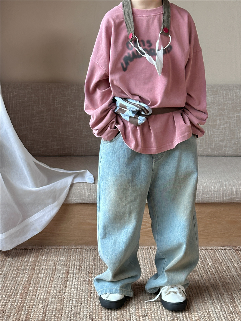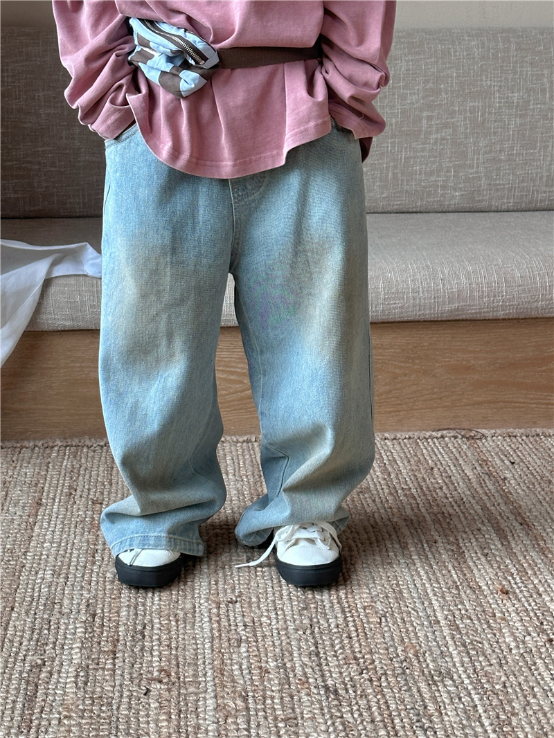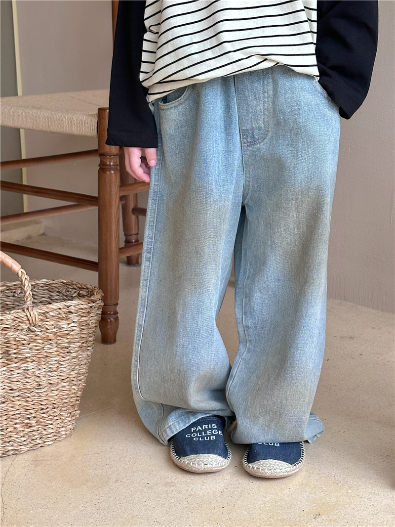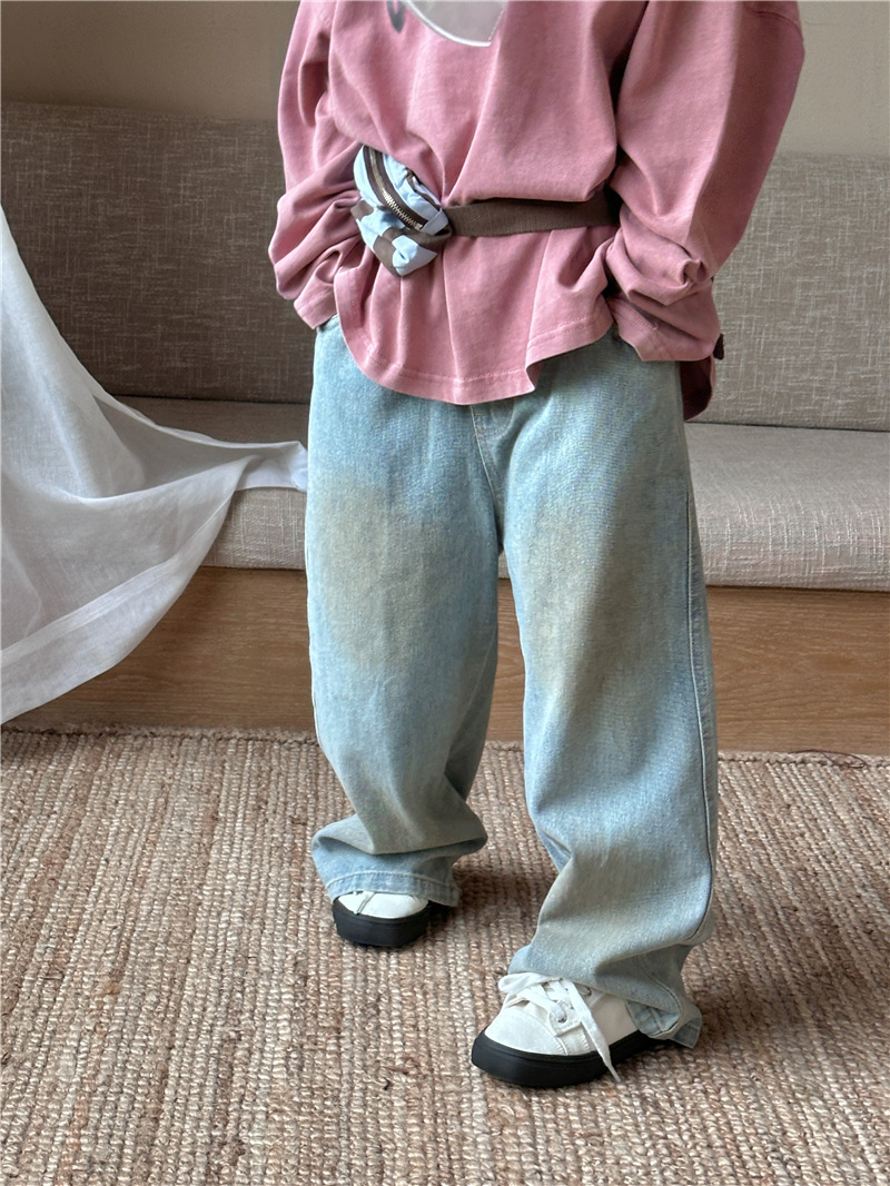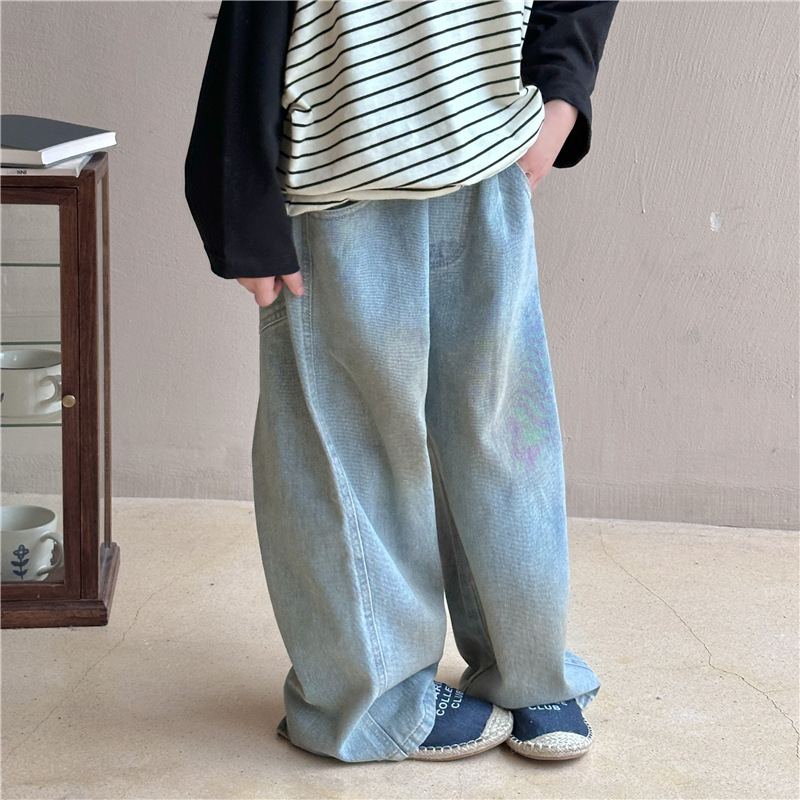 어린이용 청바지 2026 봄 신상 한국 스타일 남녀공용 스머지드 스트레이트 팬츠 아기용 다용도 캐주얼 롱팬츠 트렌디스토어 가기