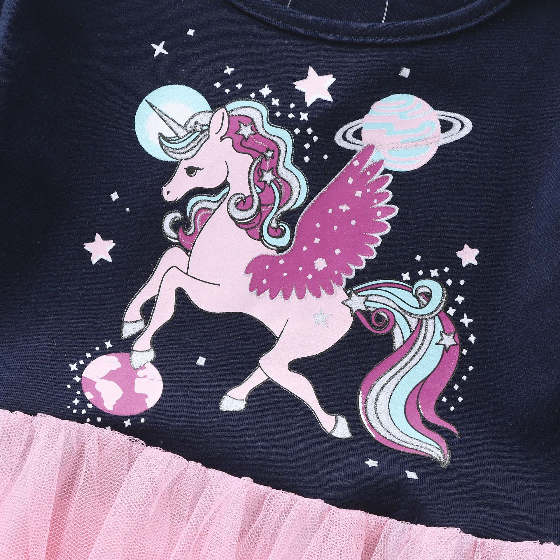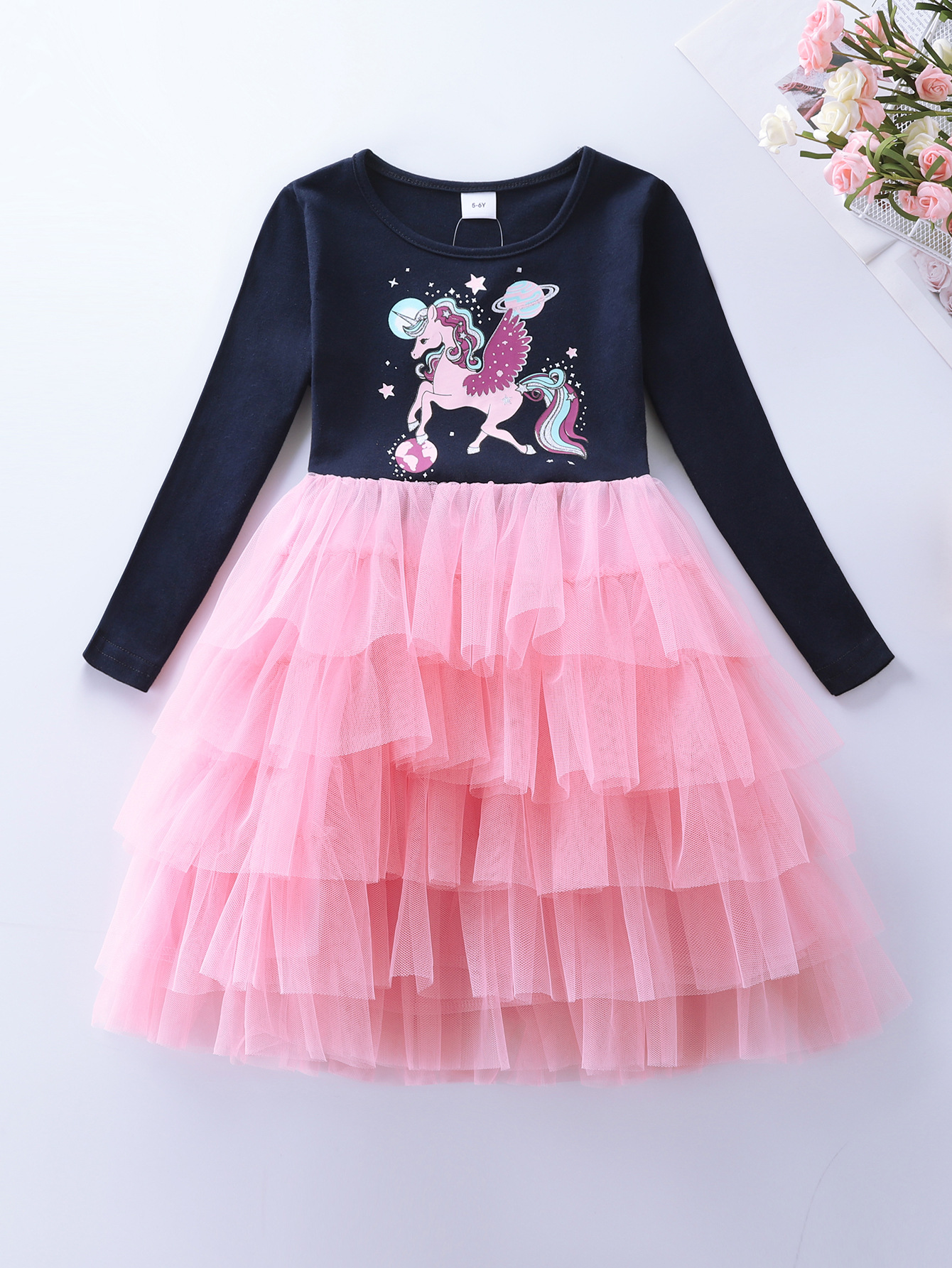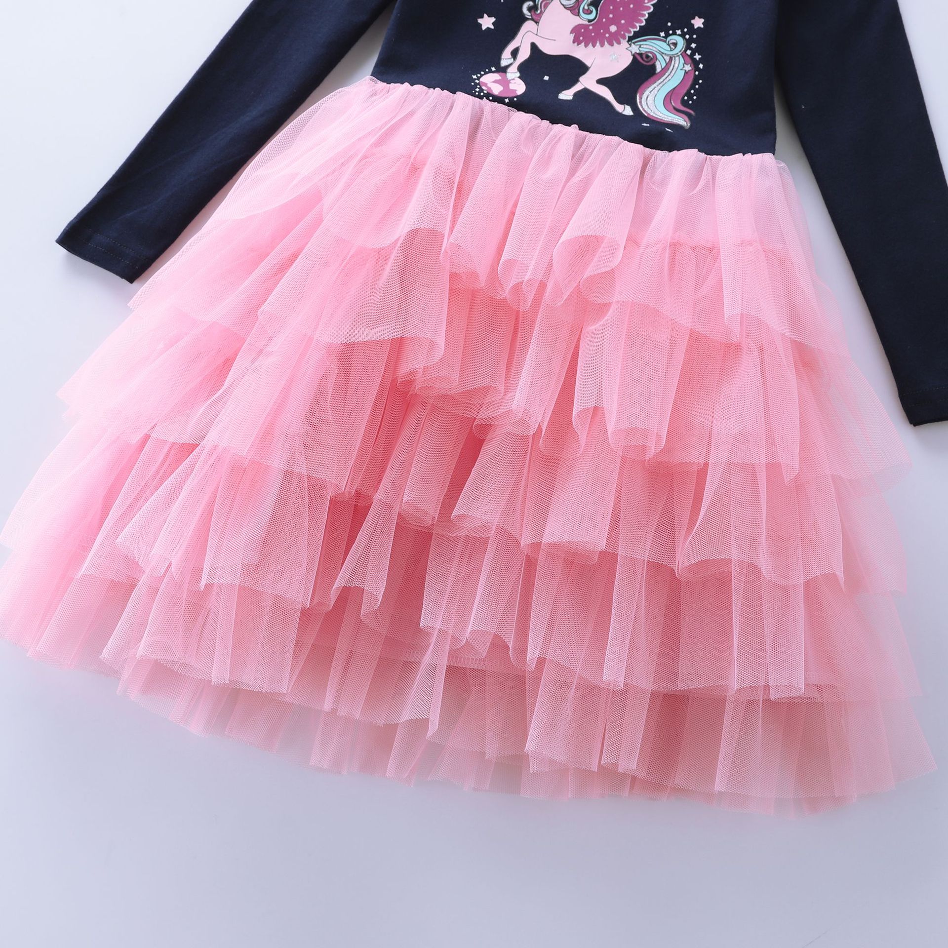 아이 소녀 긴 소매 면 만화 인쇄 유니콘 파티 공주 케이크 원피스 LH1705