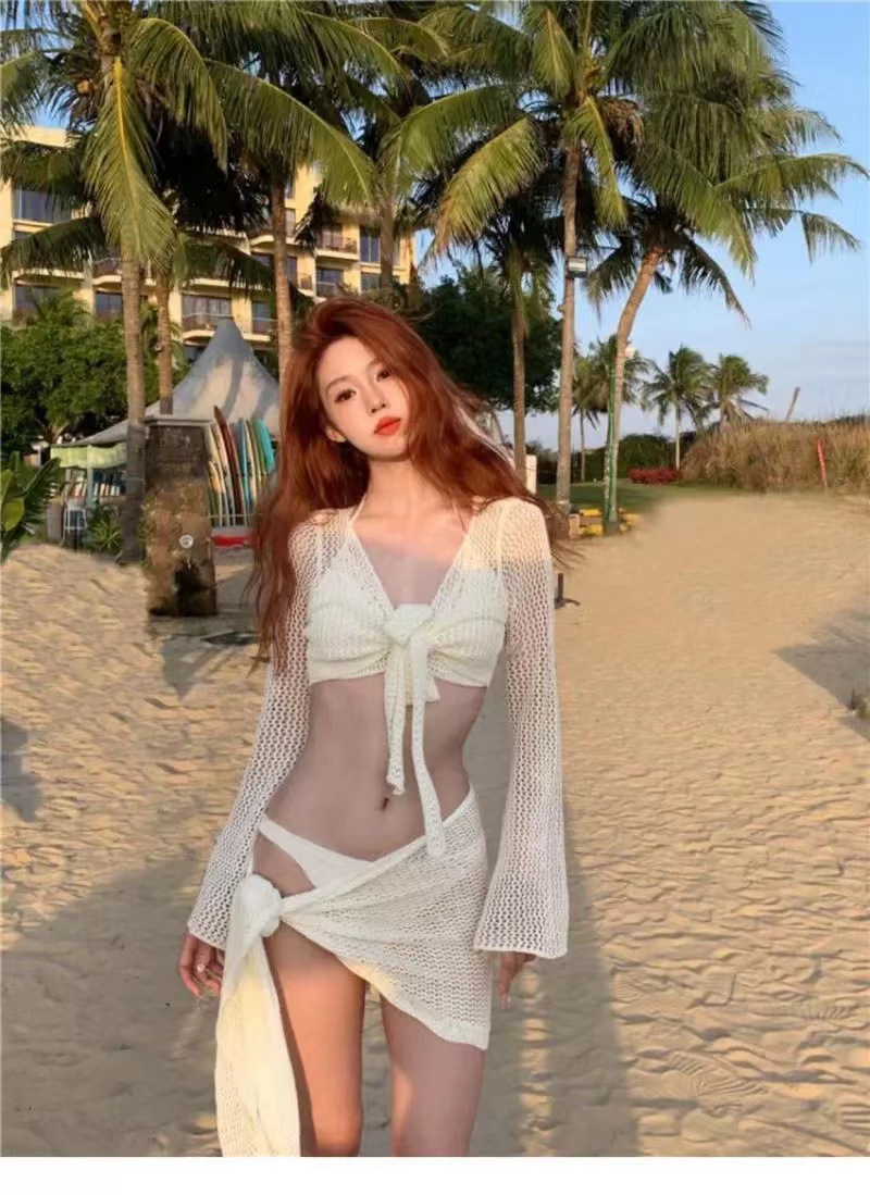 2023 여름 새로운 해변 휴가 긴팔 숄 재미 4 피스 세트 여성용 스플릿 트라이앵글 비키니 수영복