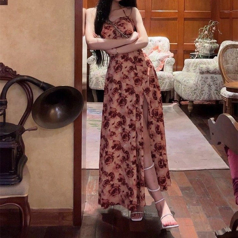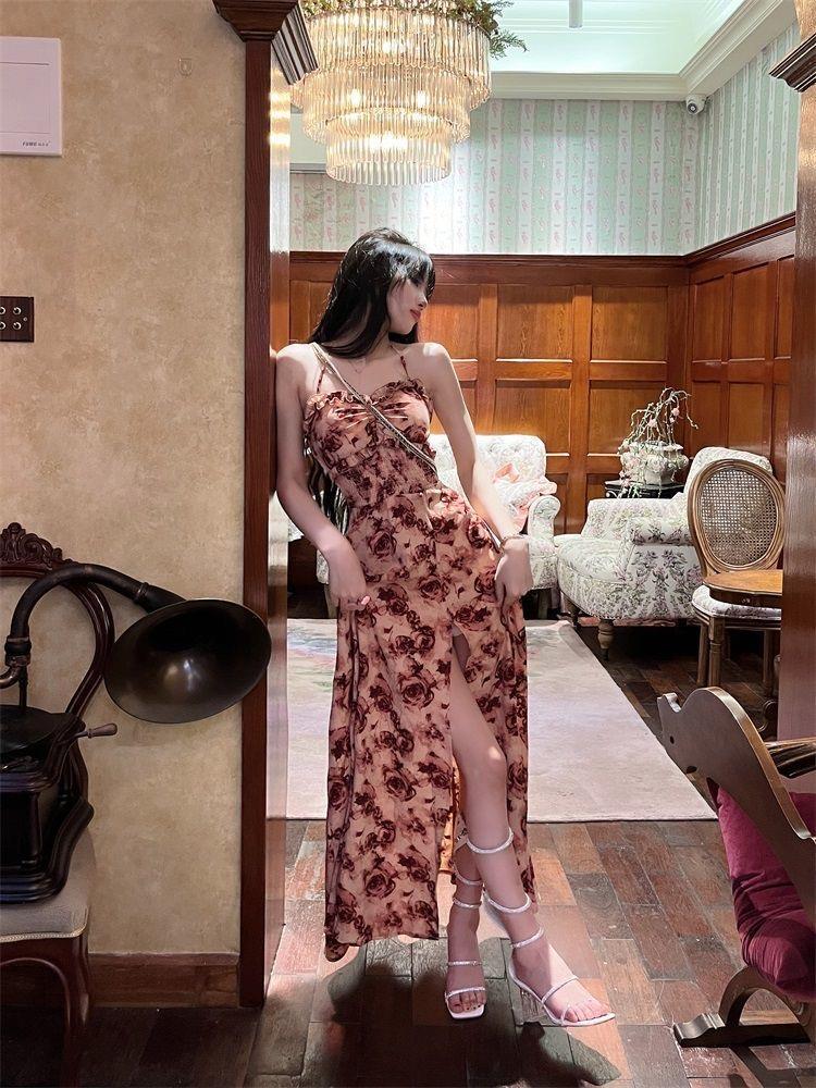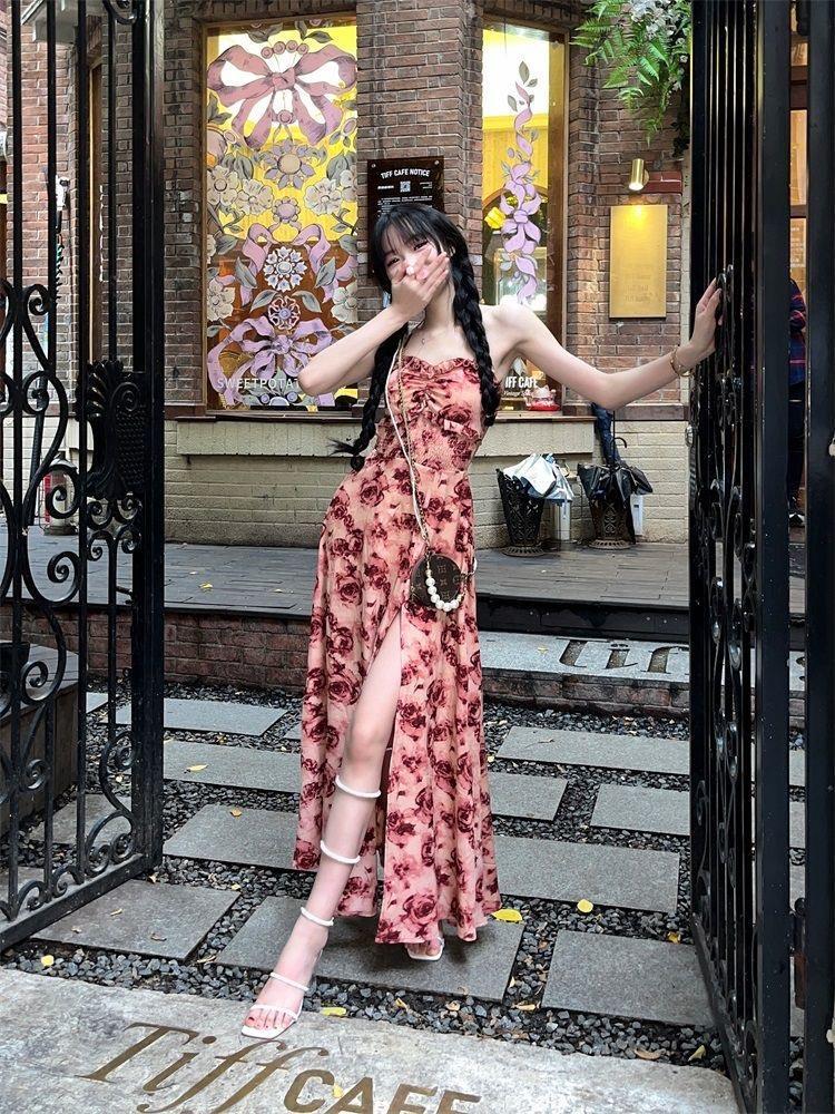 가슴 패드 + 이너 디자인, 틈새 섹시 로즈 프린트 롱 스커트, 여성스러운 하이 슬릿 홀터 드레스스토어 가기