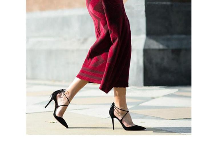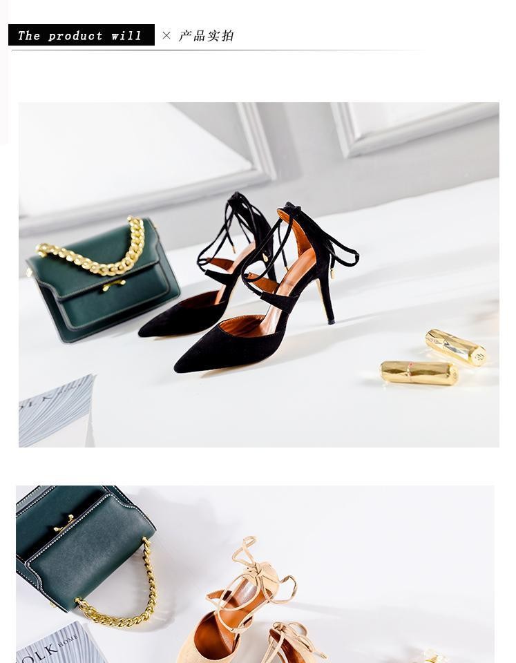 봄과 여름 2023 신선한 스타일 프랑스 소녀 하이힐 블랙 스웨이드 스틸레토 힐 샌들 뾰족한 스트랩 중공 단층 신발스토어 가기