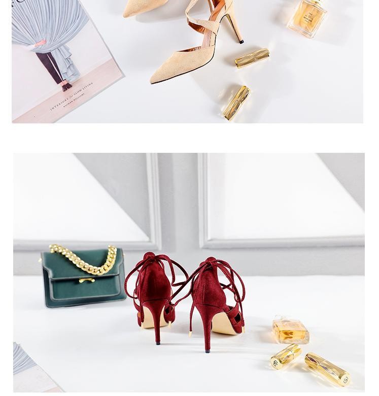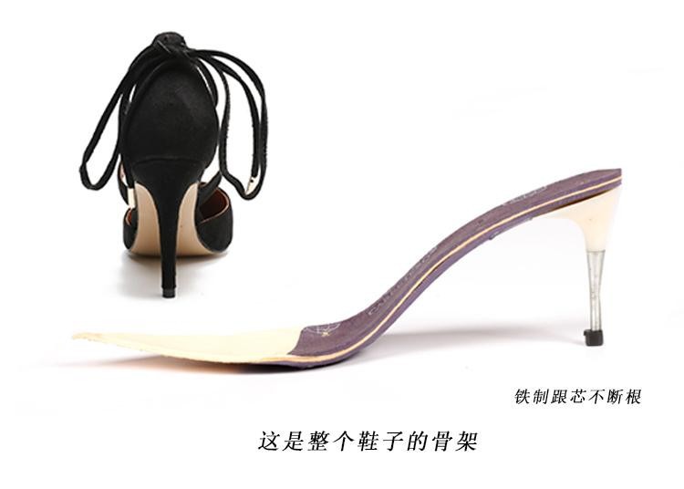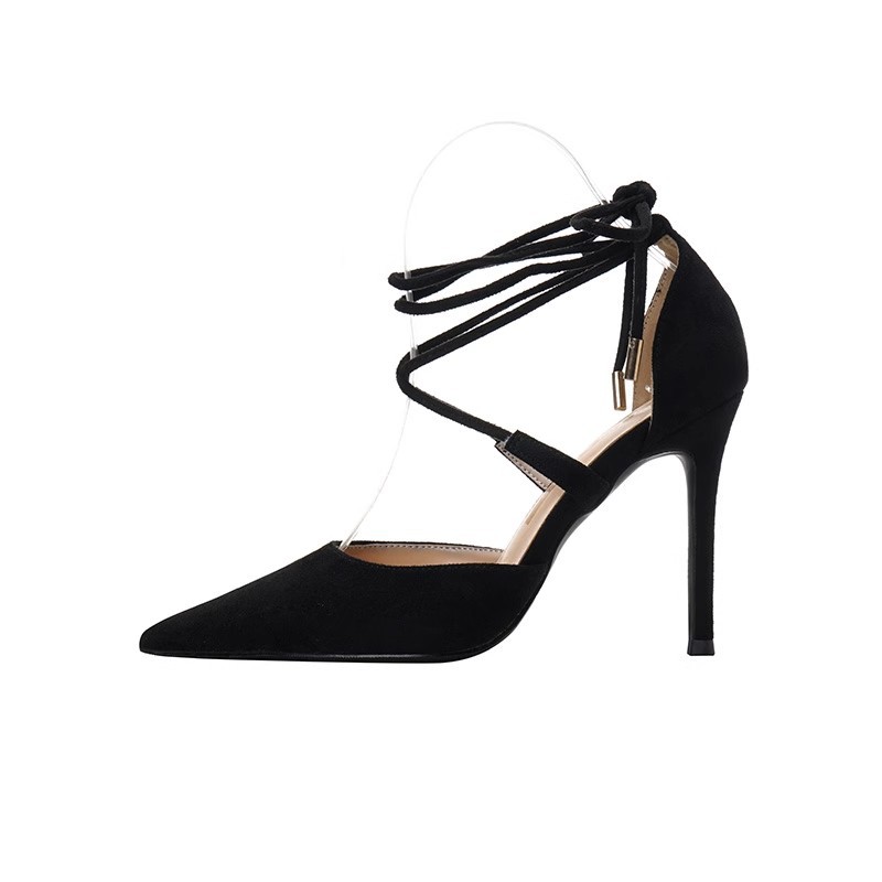 봄과 여름 2023 신선한 스타일 프랑스 소녀 하이힐 블랙 스웨이드 스틸레토 힐 샌들 뾰족한 스트랩 중공 단층 신발