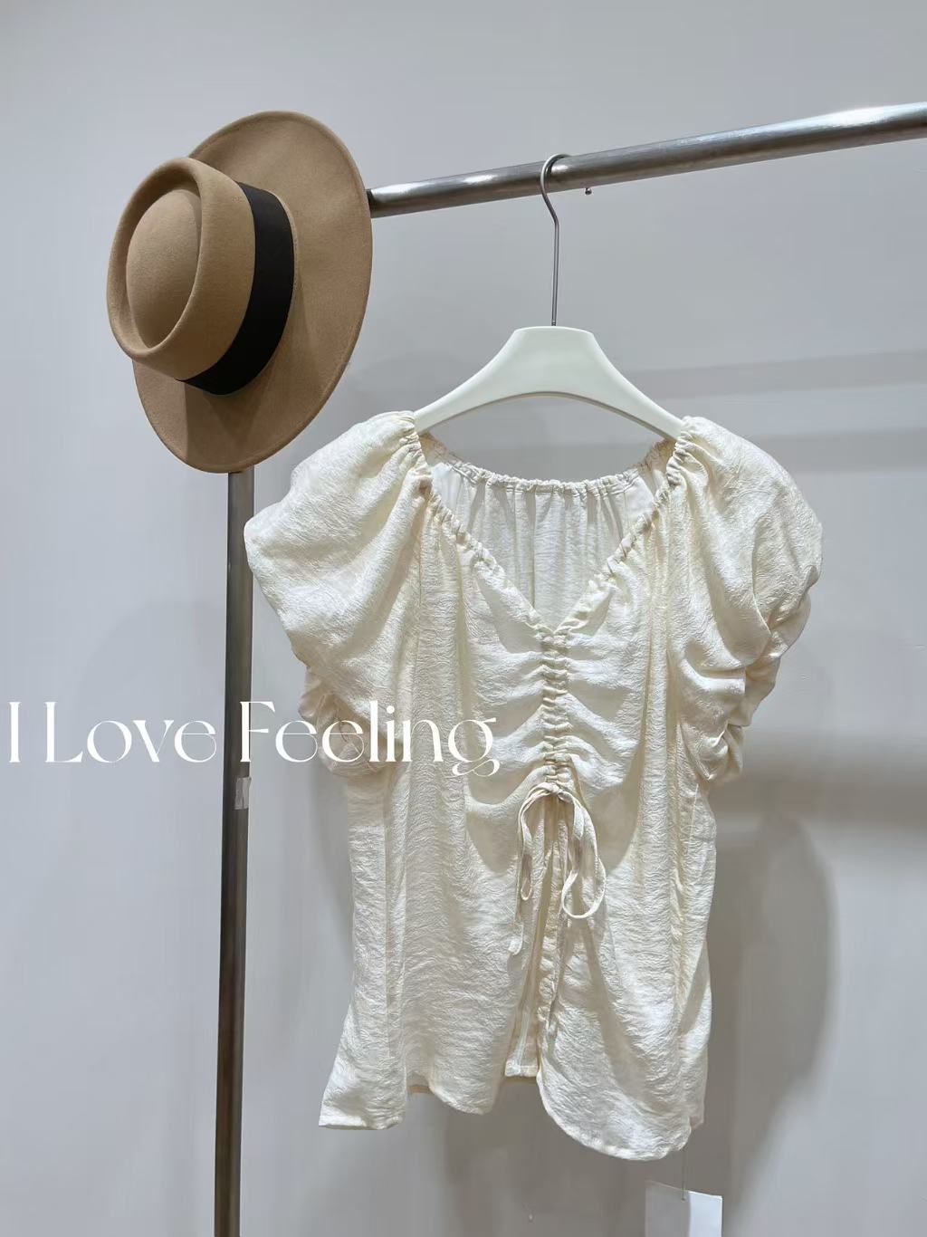 스팟 절묘한 느낌 25 여름 메일라드 드로스트링 하이엔드 스몰 브이넥 플리츠 여성용 레이디스 랜턴 슬리브 탑스토어 가기