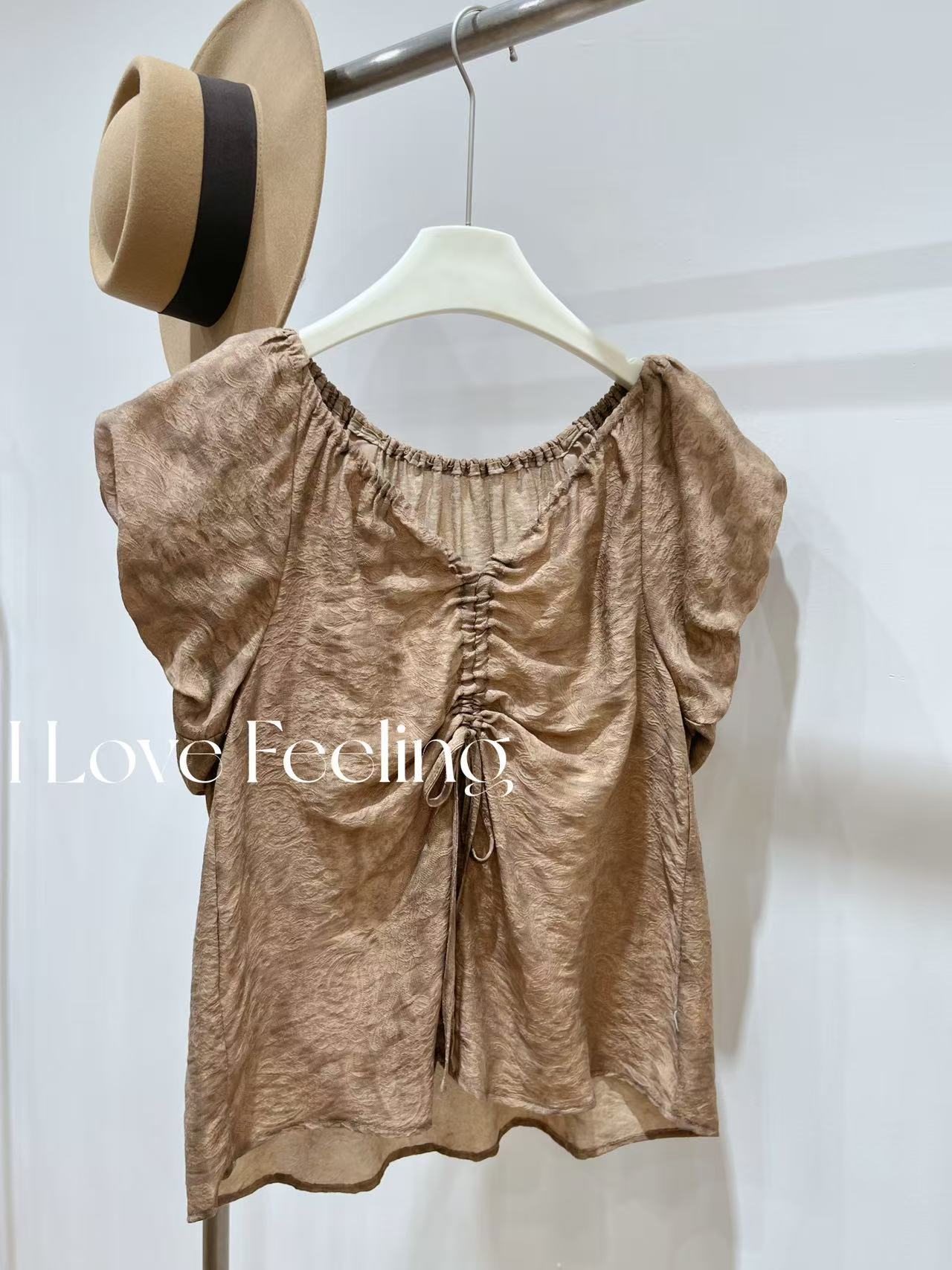 스팟 절묘한 느낌 25 여름 메일라드 드로스트링 하이엔드 스몰 브이넥 플리츠 여성용 레이디스 랜턴 슬리브 탑