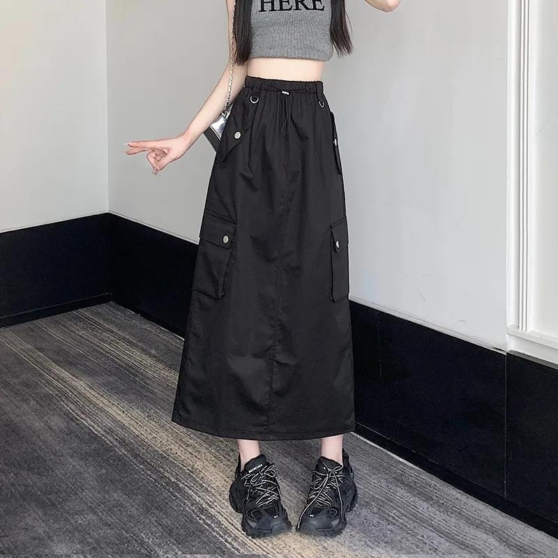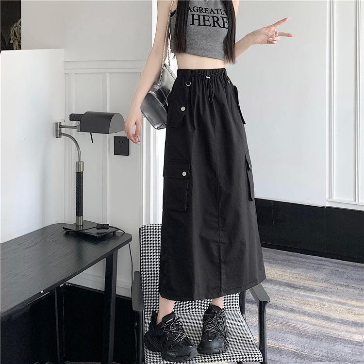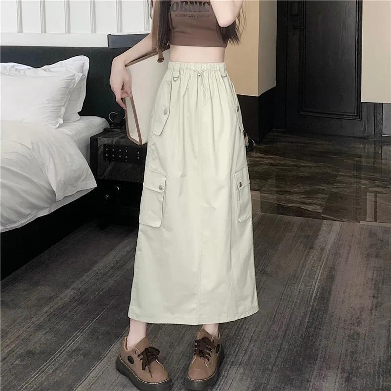 942 여름 새로운 미국 스타일 레트로 스트링 툴링 스커트 분할 높은 허리 느슨한 A-라인 미디 스커트