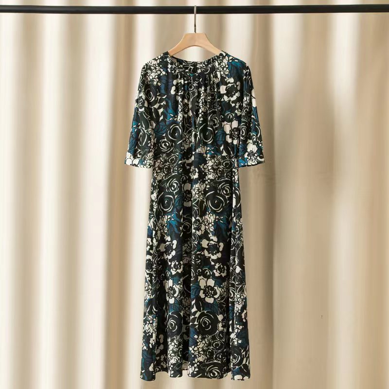 M 가족 이른 가을 새로운 뽕나무 실크 인쇄 라운드 넥 버블 슬리브 허리 프랑스어 원피스 여성