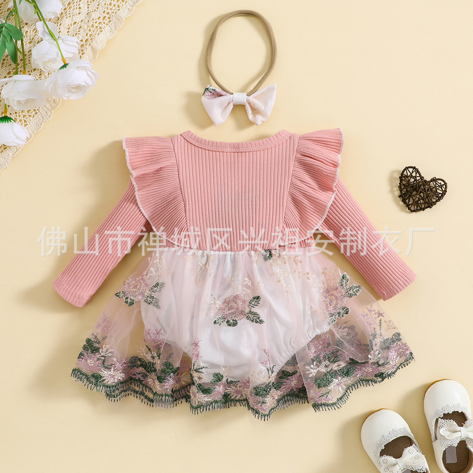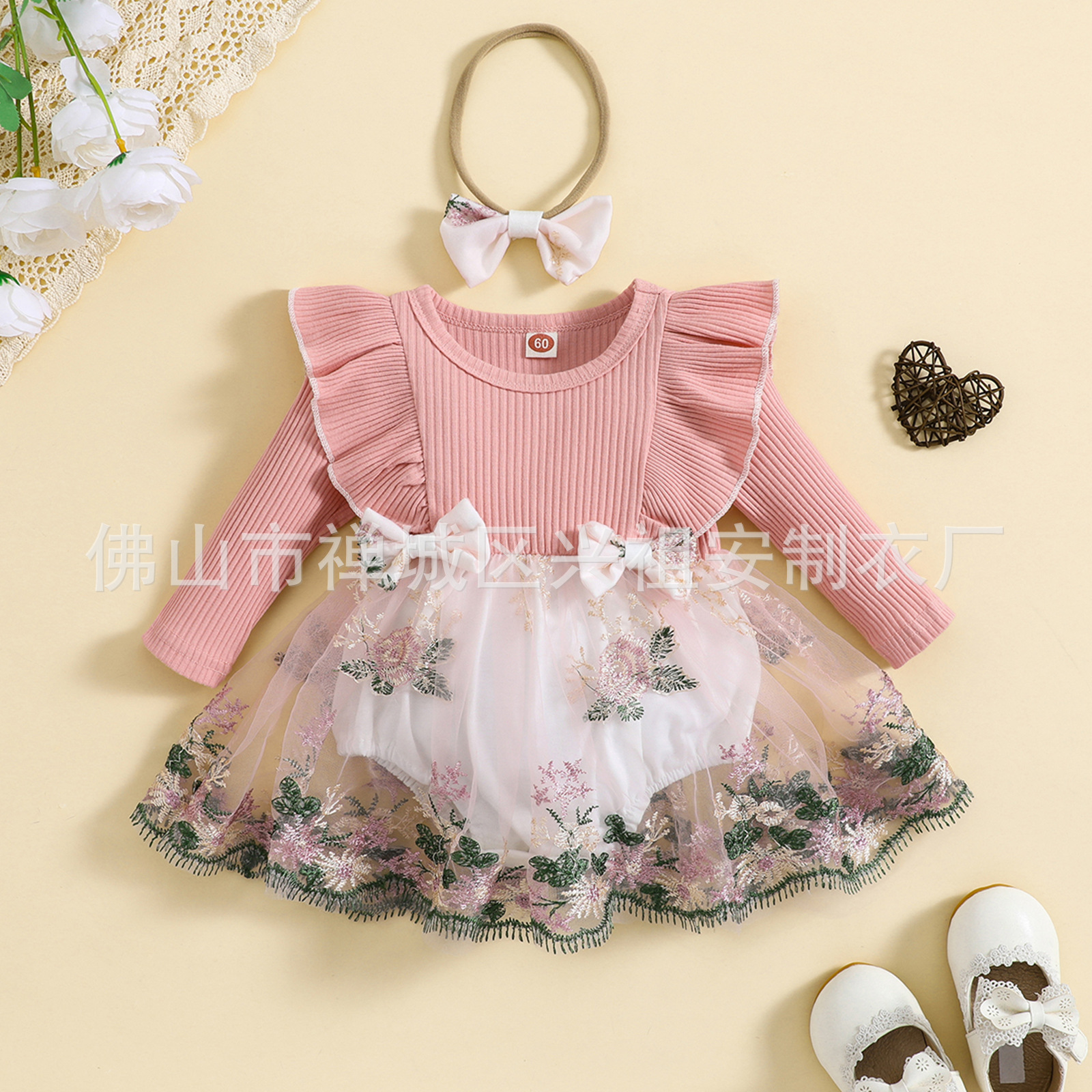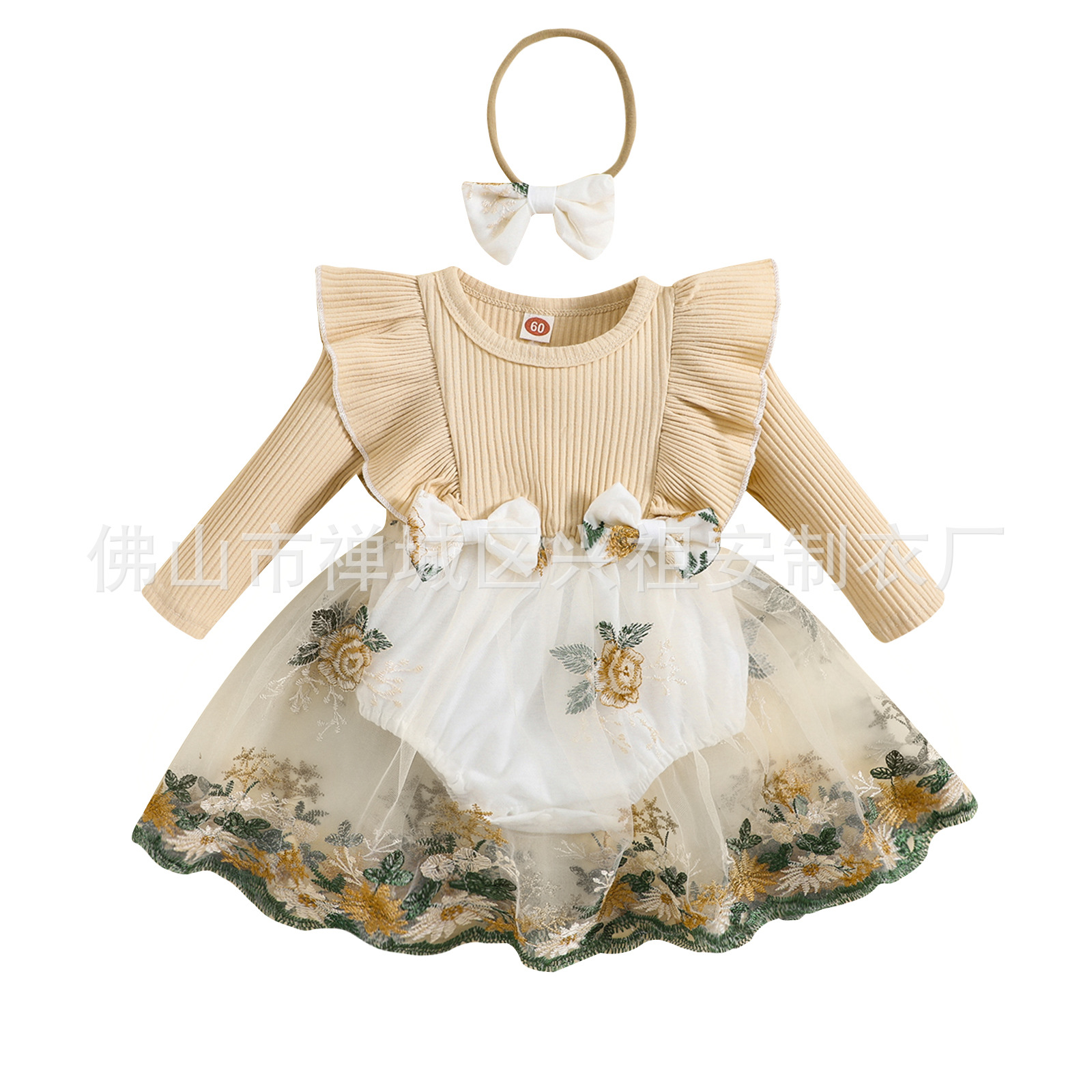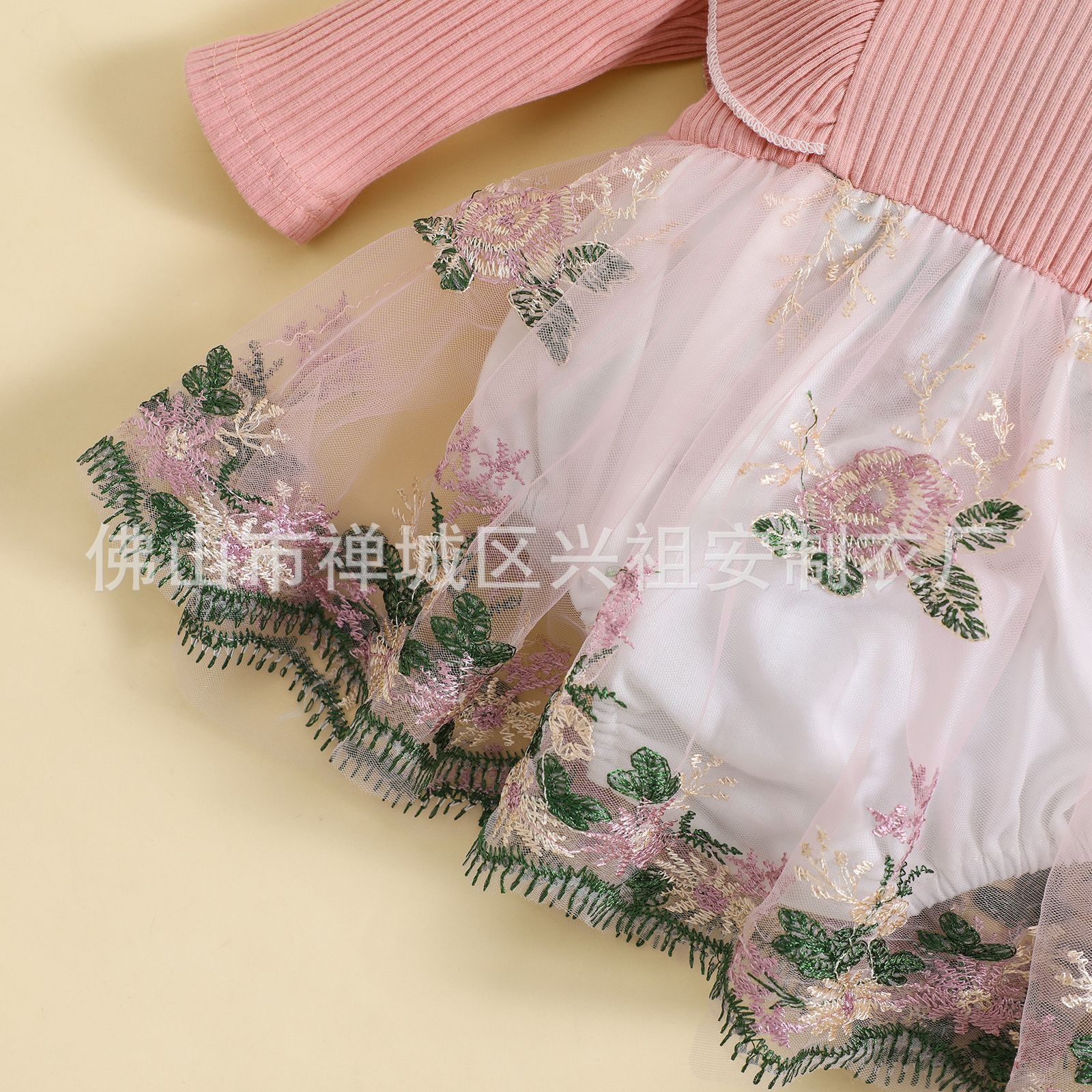 새로운 아기 소녀 봄과 가을 주름 긴 소매 모자이크 꽃 메쉬 패션 원피스