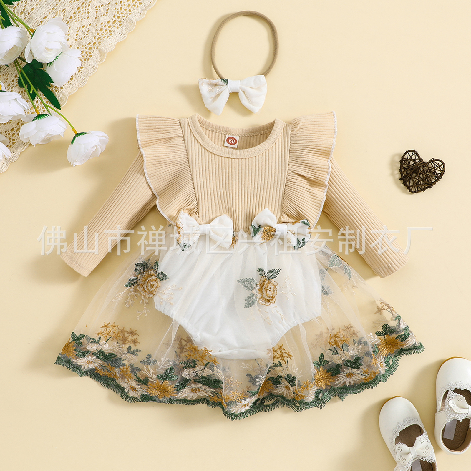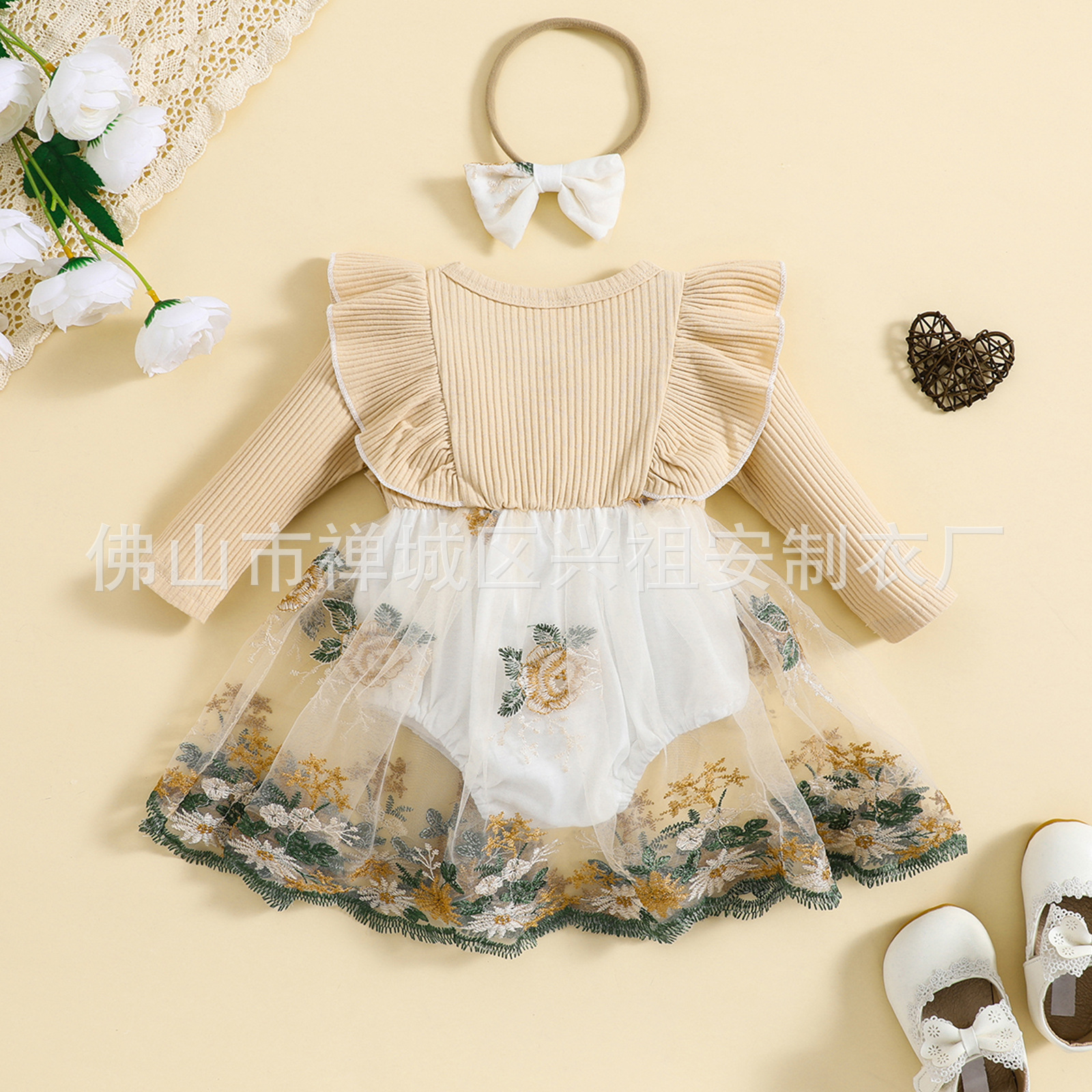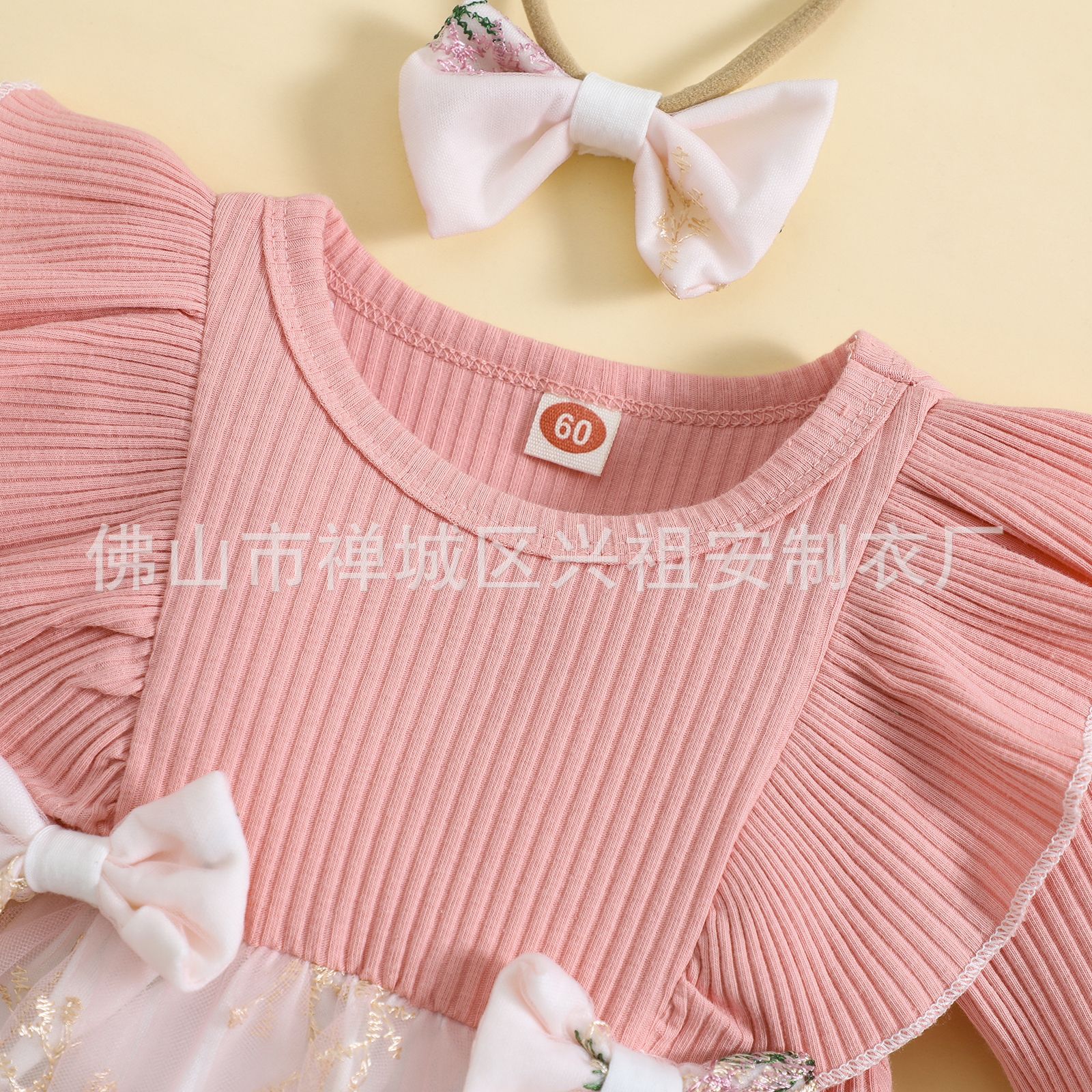 새로운 아기 소녀 봄과 가을 주름 긴 소매 모자이크 꽃 메쉬 패션 원피스