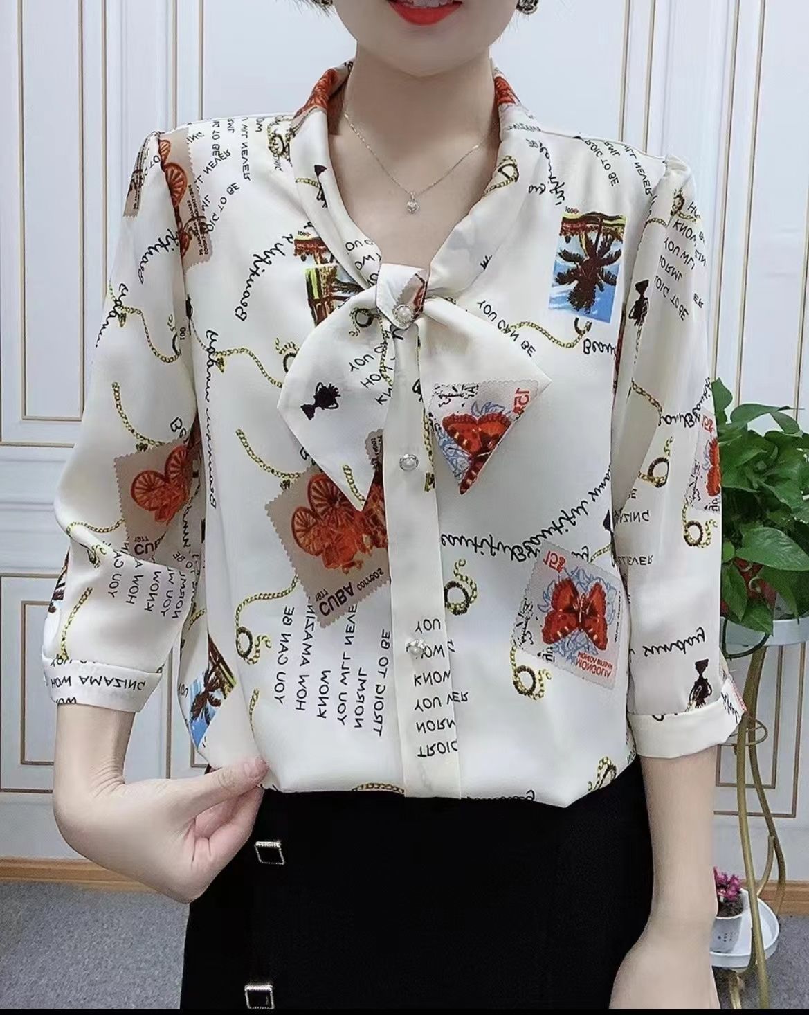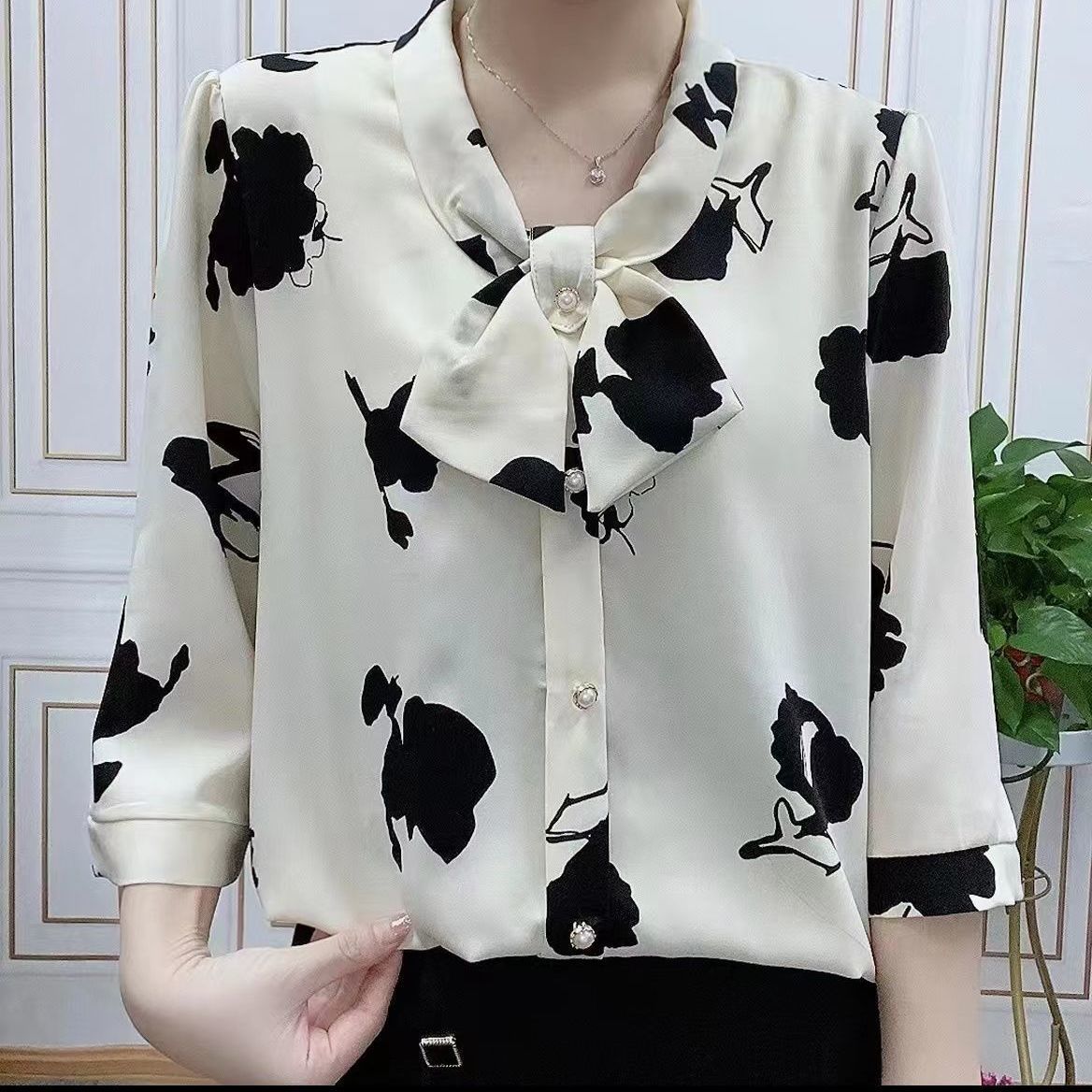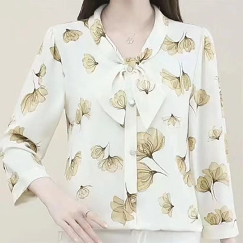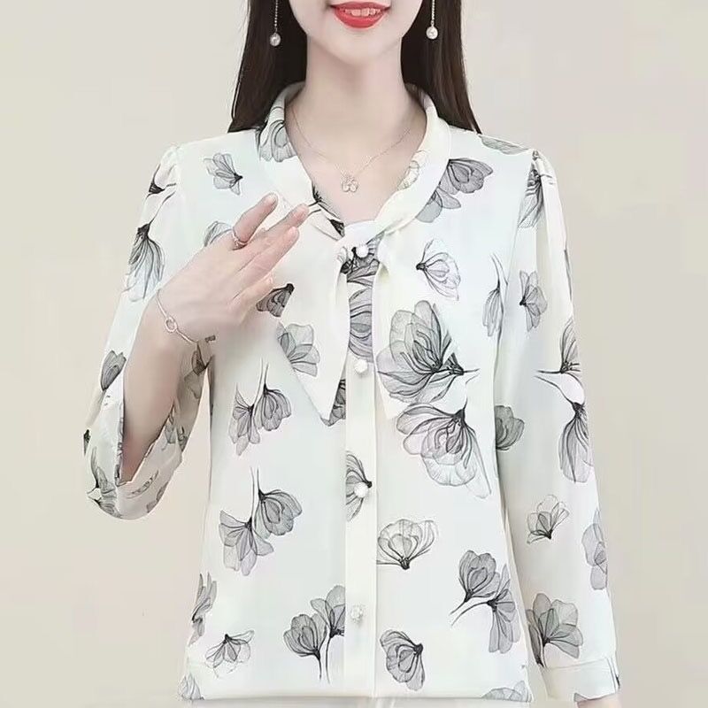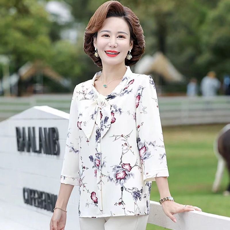 3 점 슬리브 리본 쉬폰 셔츠 2023 여름 새로운 패션 하이 엔드 어머니의 느슨한 슬림 얇은 셔츠 여성