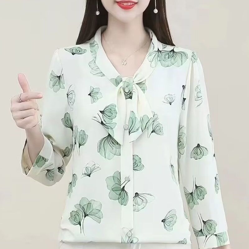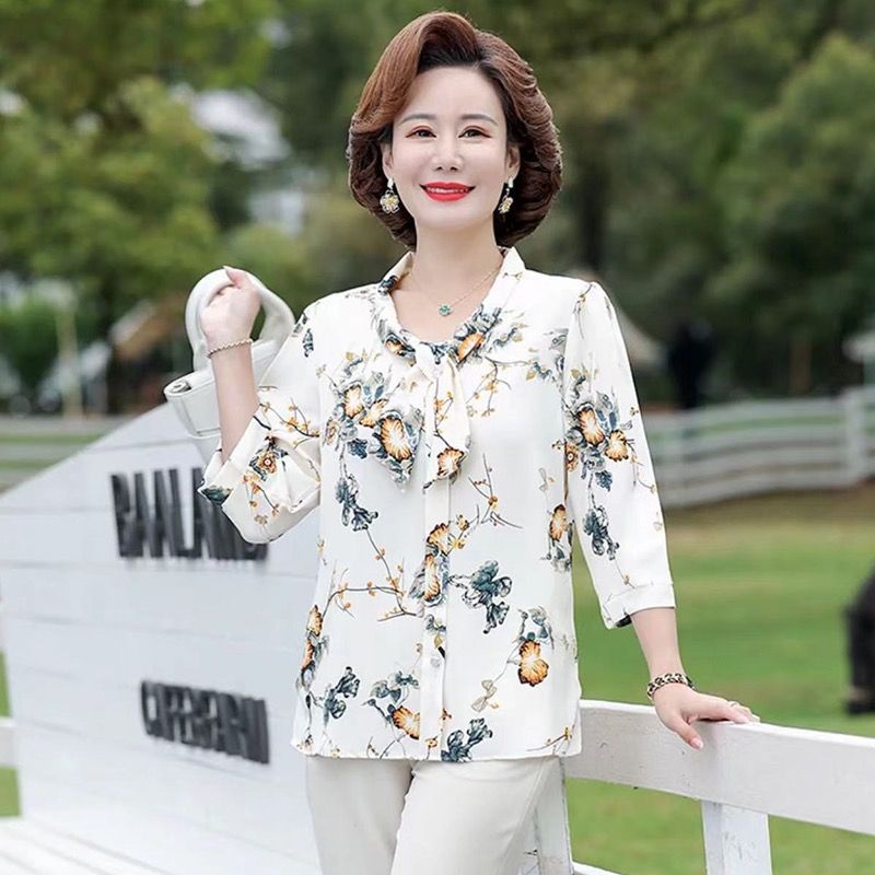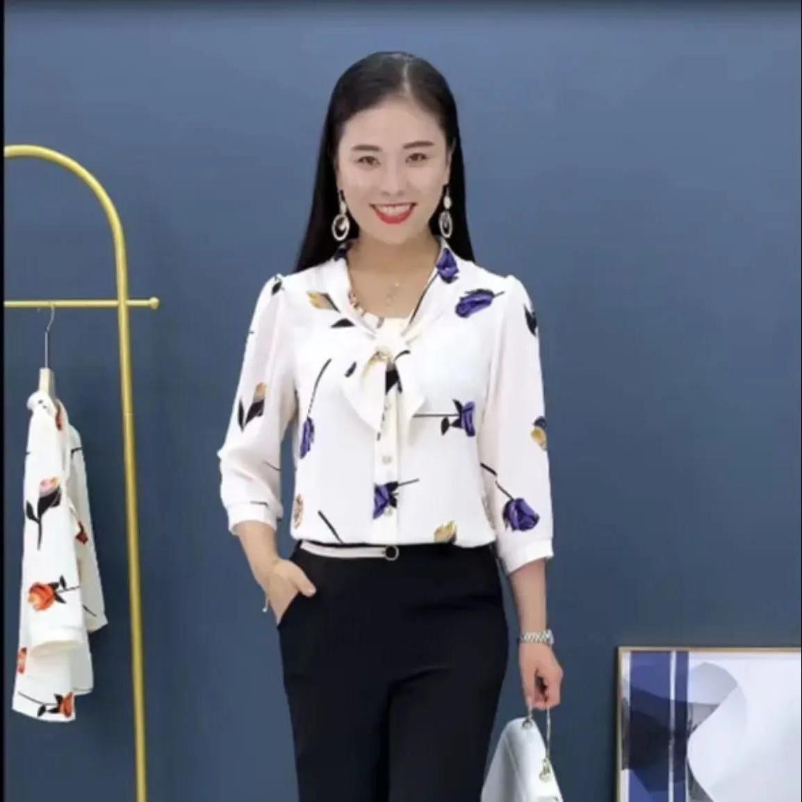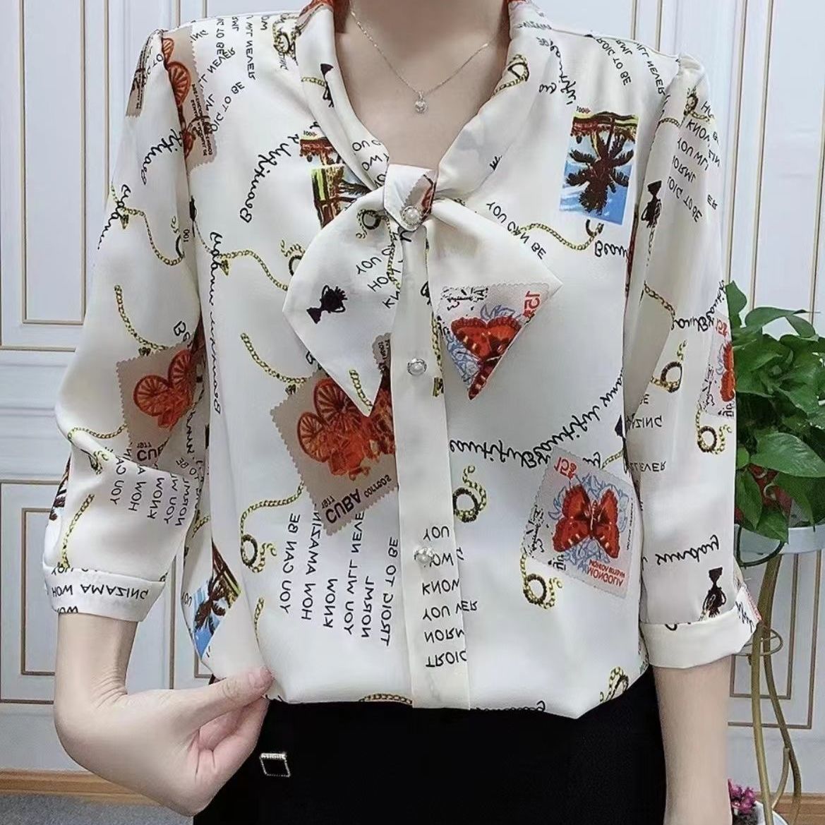 3 점 슬리브 리본 쉬폰 셔츠 2023 여름 새로운 패션 하이 엔드 어머니의 느슨한 슬림 얇은 셔츠 여성스토어 가기