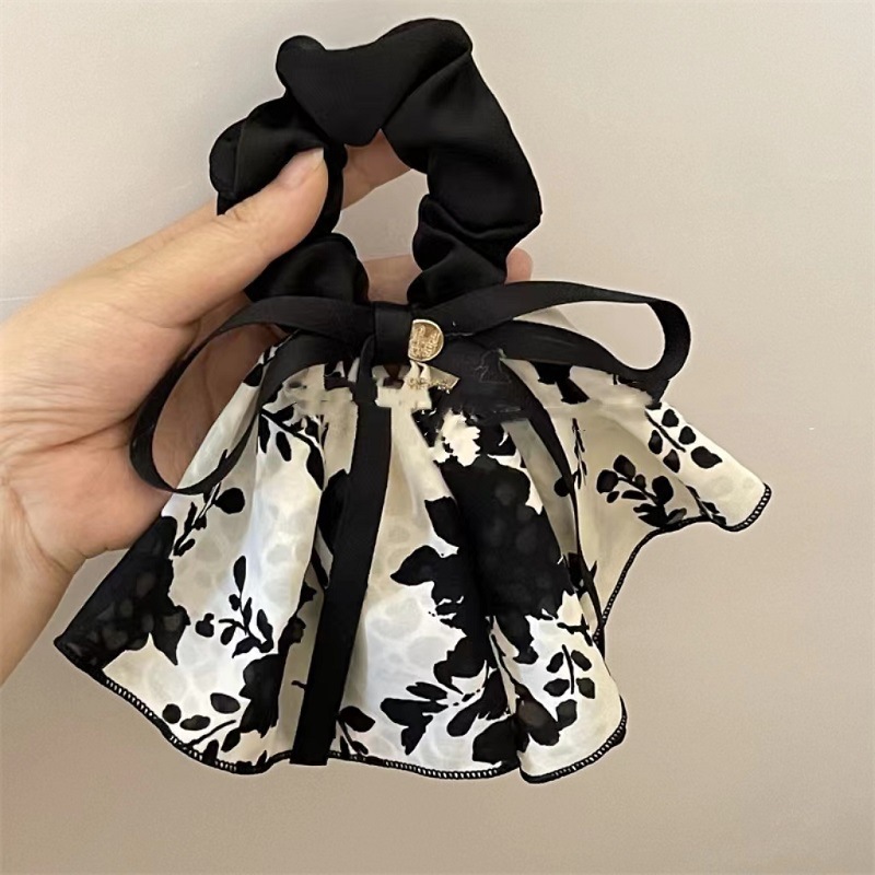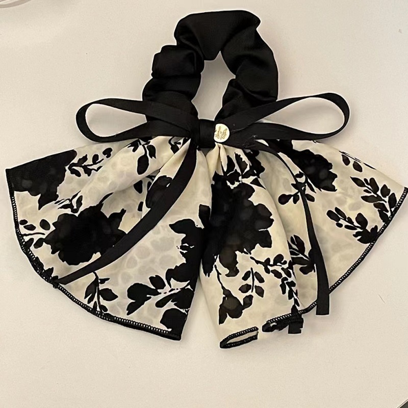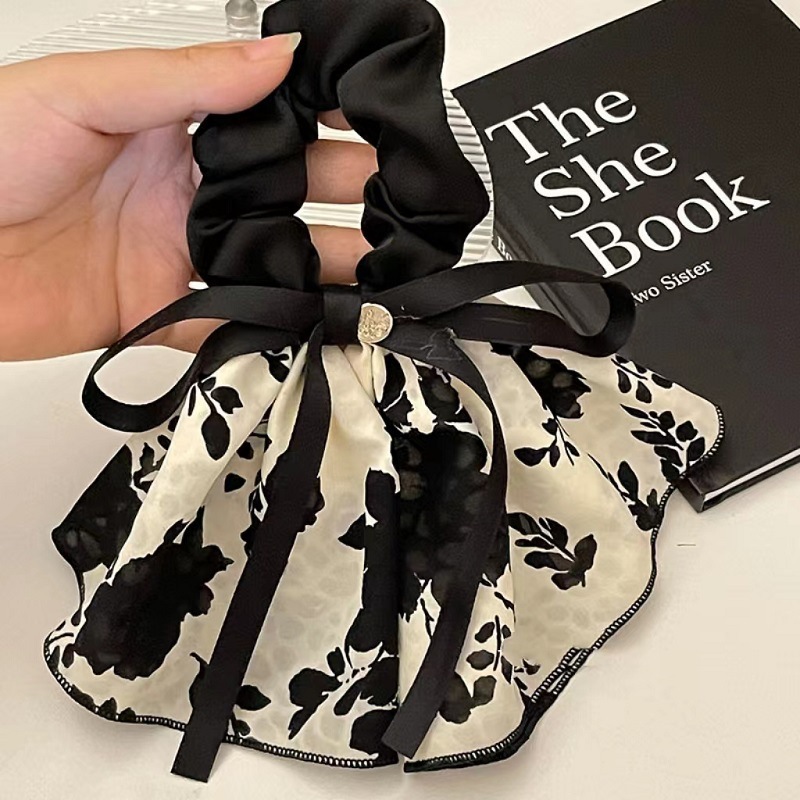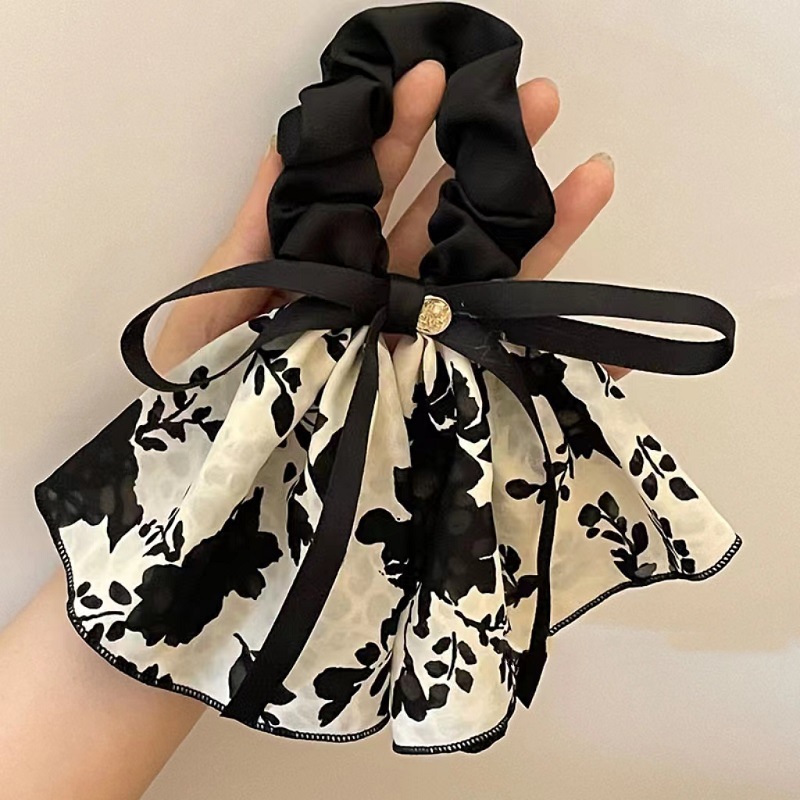 2023 새로운 빈티지 프린트 보우 잉크 스커트 창자 머리 반지 프랑스어 우아한 부드러운 우아한 헤어 로프 헤어 액세서리