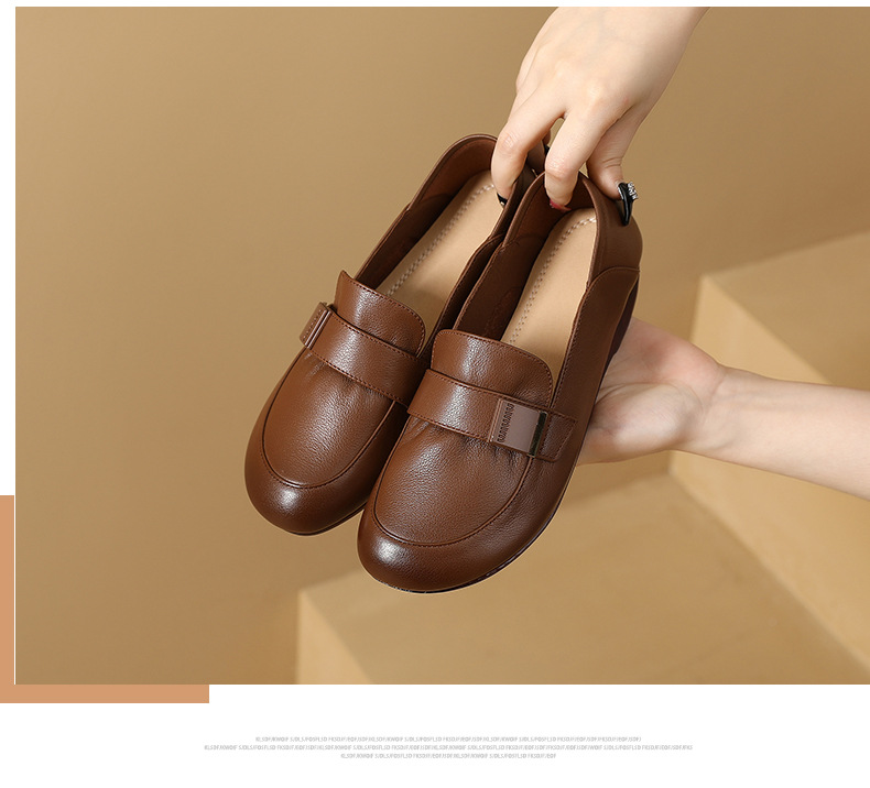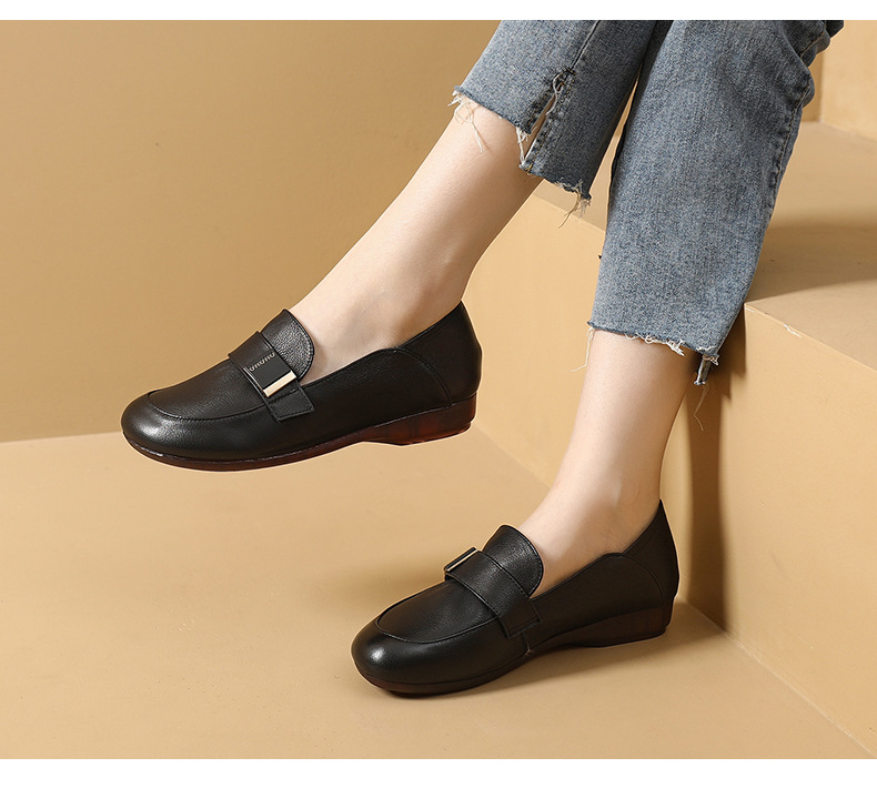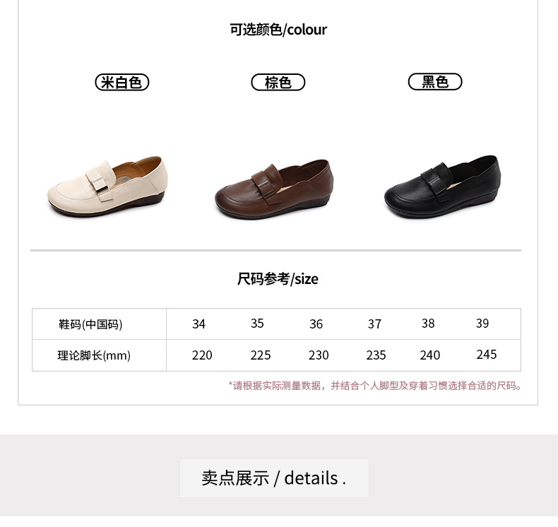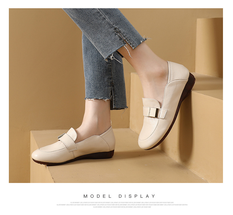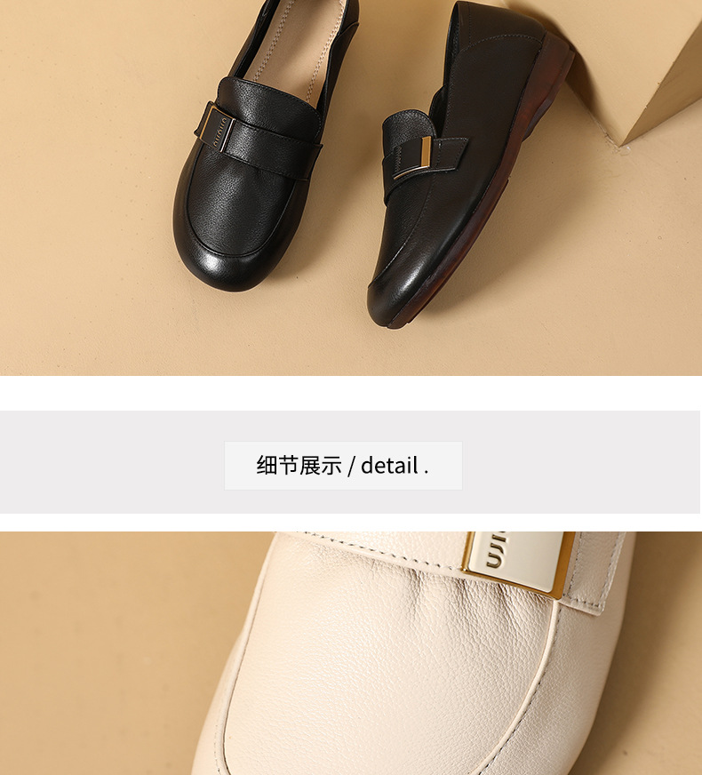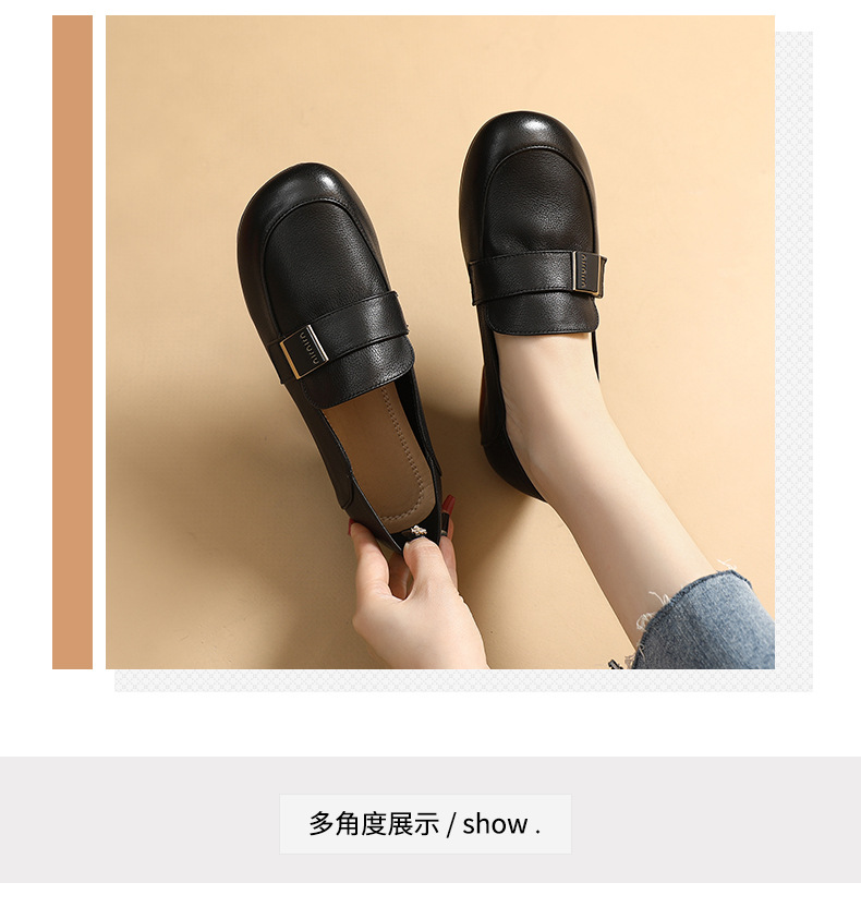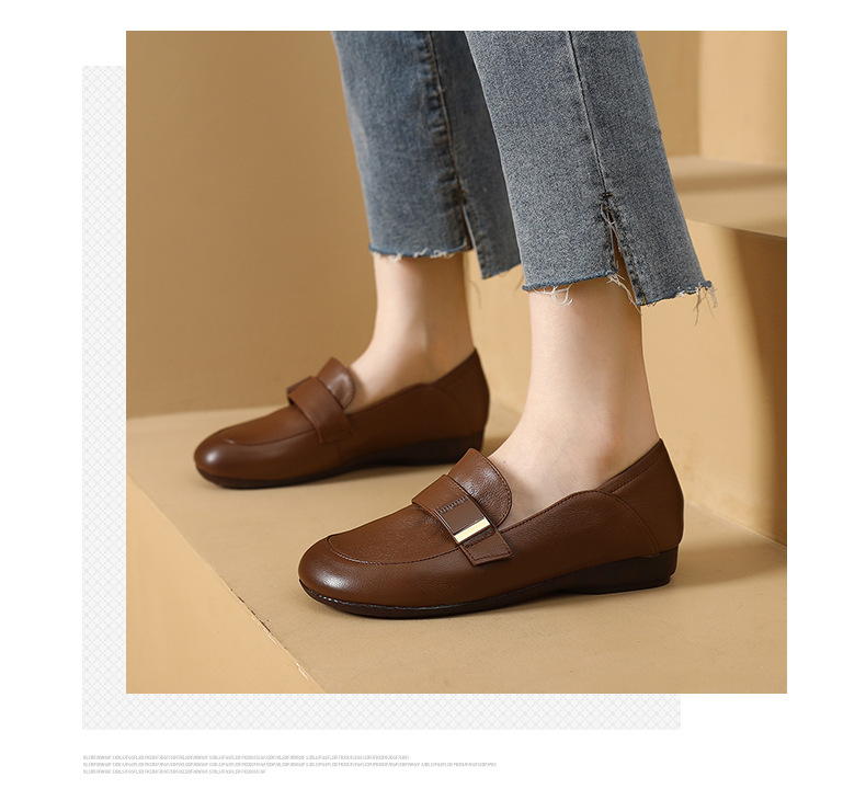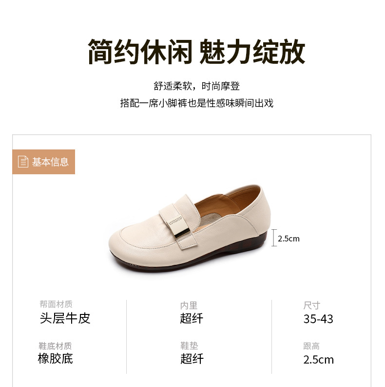 라운드 토 플랫 로퍼 여자의 2023 봄 새로운 탑 레이어 소가죽 소프트 바닥 플러스 사이즈 43 싱글 신발 스퀘어 버클 콩 신발스토어 가기