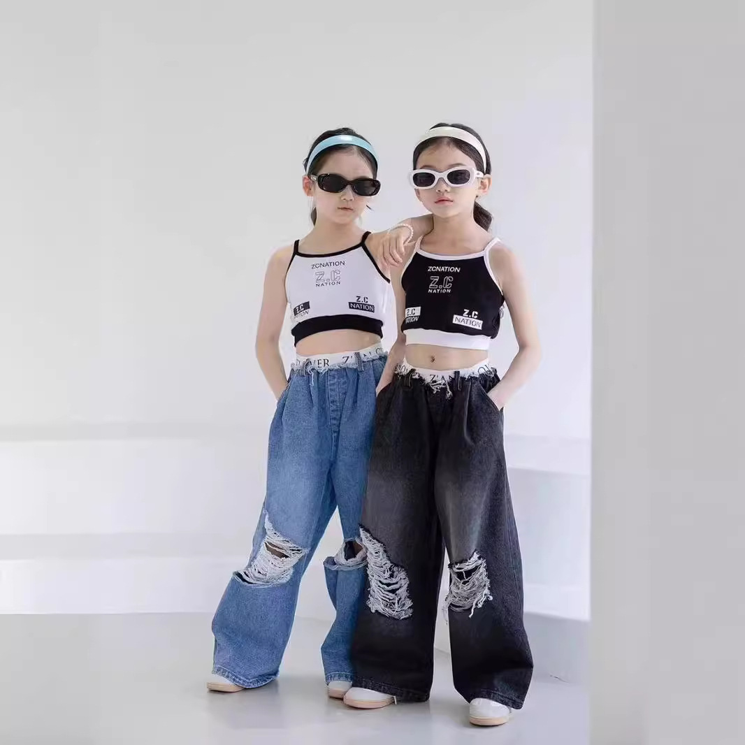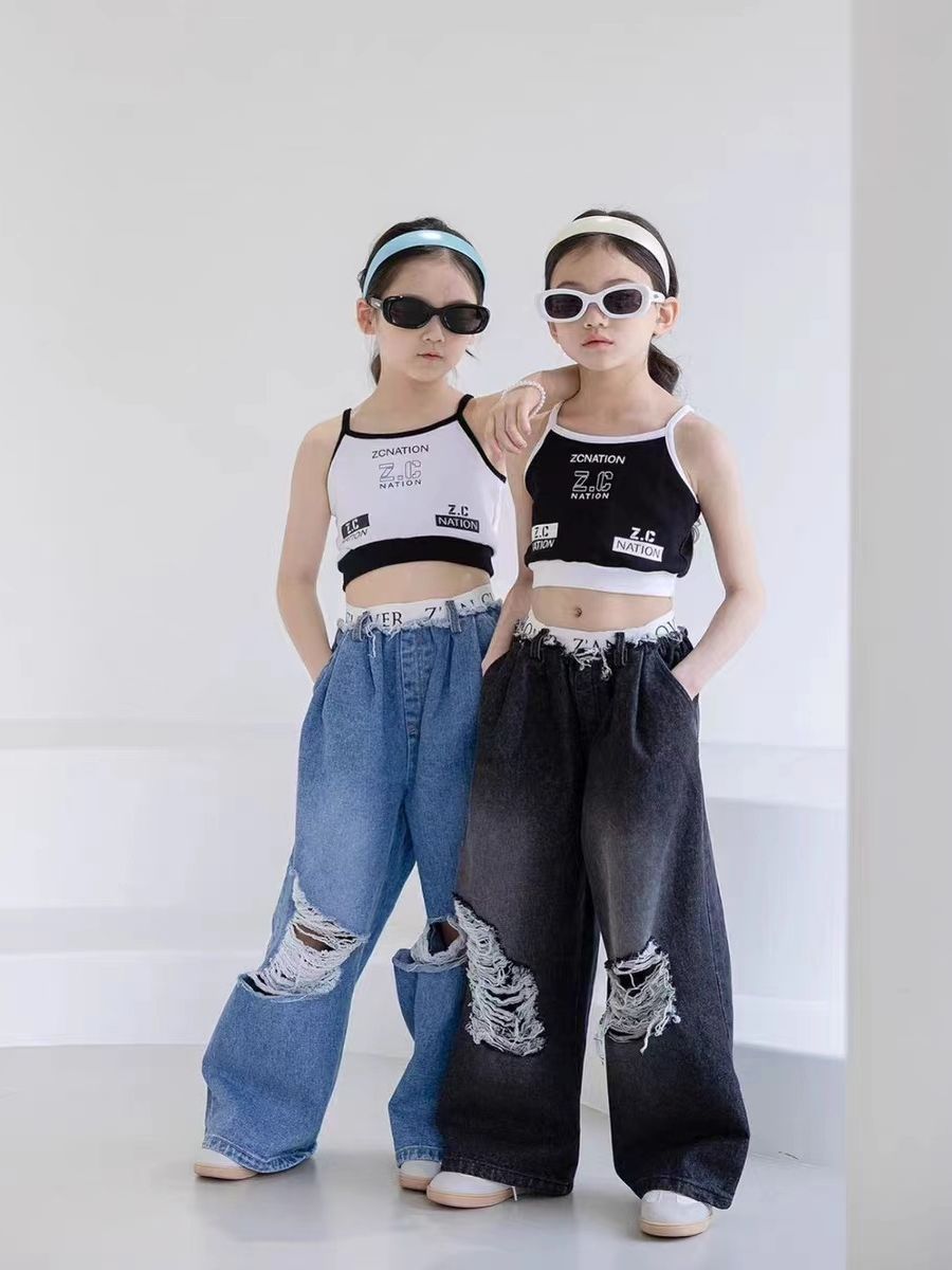 아동복 23 여름 한국 부모-자식 찢어진 편지 미드 웨이스트 청바지 + 성격 편지 캐미솔 세트스토어 가기