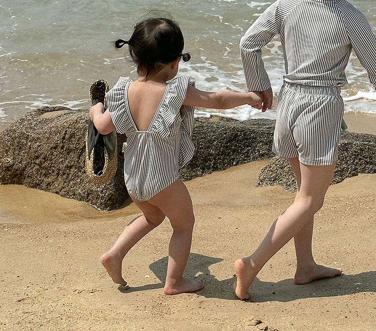 소년과 소녀를위한 한국 어린이 수영복 아기 자외선 차단제 속건 스트라이프 수영복 형제 자매 긴팔 세트 캐주얼 수영복